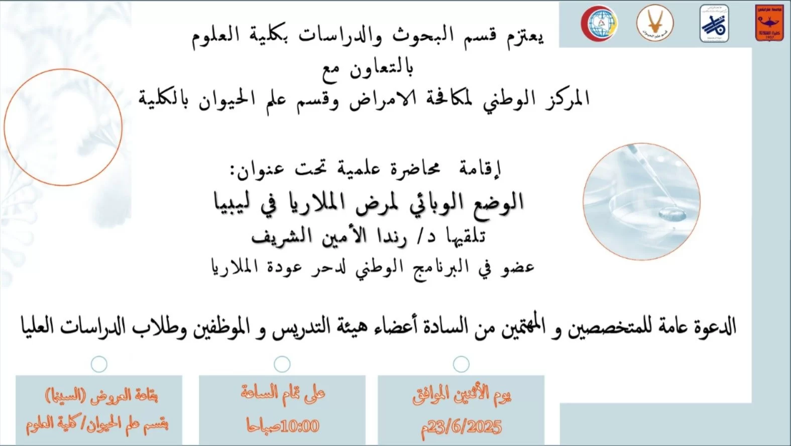 اعلان يعتزم قسم البحوث والإستشارات بكلية العلوم بالتعاون مع المركز الوطني لمكافحة الامراض وقسم علم الحيوان بالكلية إقامة محاضرة علمية تحت عنوان : الوضع الوبائي لمرض الملاريا في ليبيا. تلقيها د. رندا الأمين الشريف عضو في البرنامج الوطني لدحر عودة الملاريا