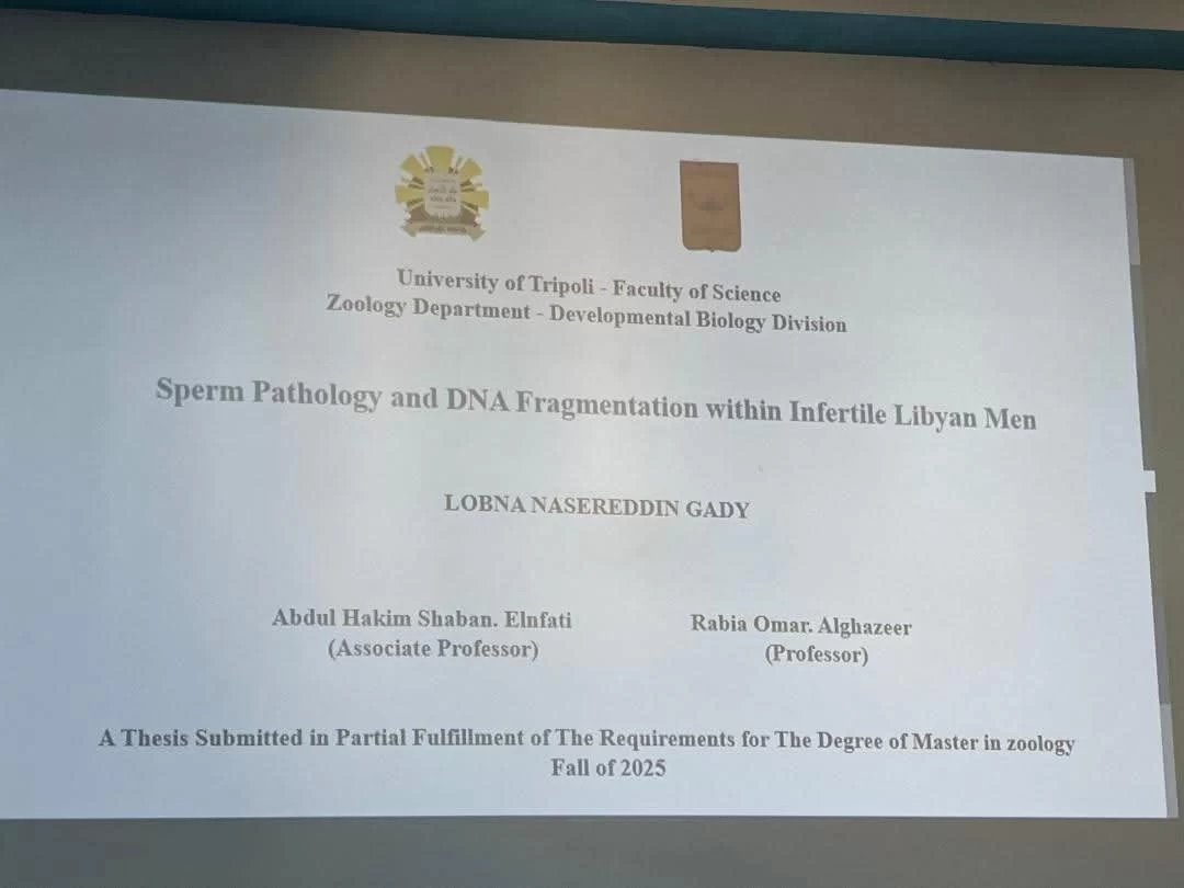 تم أمس الأحد الموافق 26 /2025/10 بفضل الله وتوفيقه مناقشة رسالة الماجستير المقدمة من الطالبة لبنى نصر الدين مصباح القاضي بعنوان " التشوهات الظاهرية وتكسر المادة الوراثية للحيوانات المنوية في الرجال المصاببن بالعقم في ليييا " وكانت لجنة المناقشة مكونة من :د. عبد الحكيم شعب
