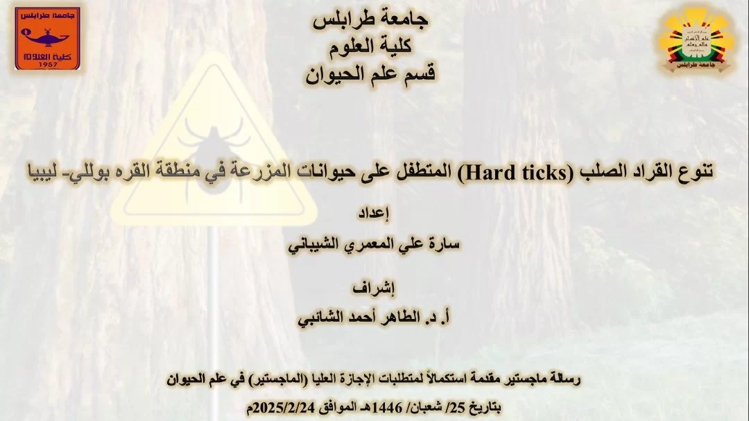 بتوفيق من الله عز وجل تمت مناقشة رسالة الإجازة العالية (الماجستير) اليوم الاثنين الموافق 24/02/2025م على تمام الساعة الثانية عشر ظهرا، والمقدمة من الطالبة سارة علي المعمري الشيباني. رسالتها بعنوان " تنوع القراد الصلب (Hard ticks) المتطفل على حيوانات المزرعة في منطقة القره بوللي- ليبيا "