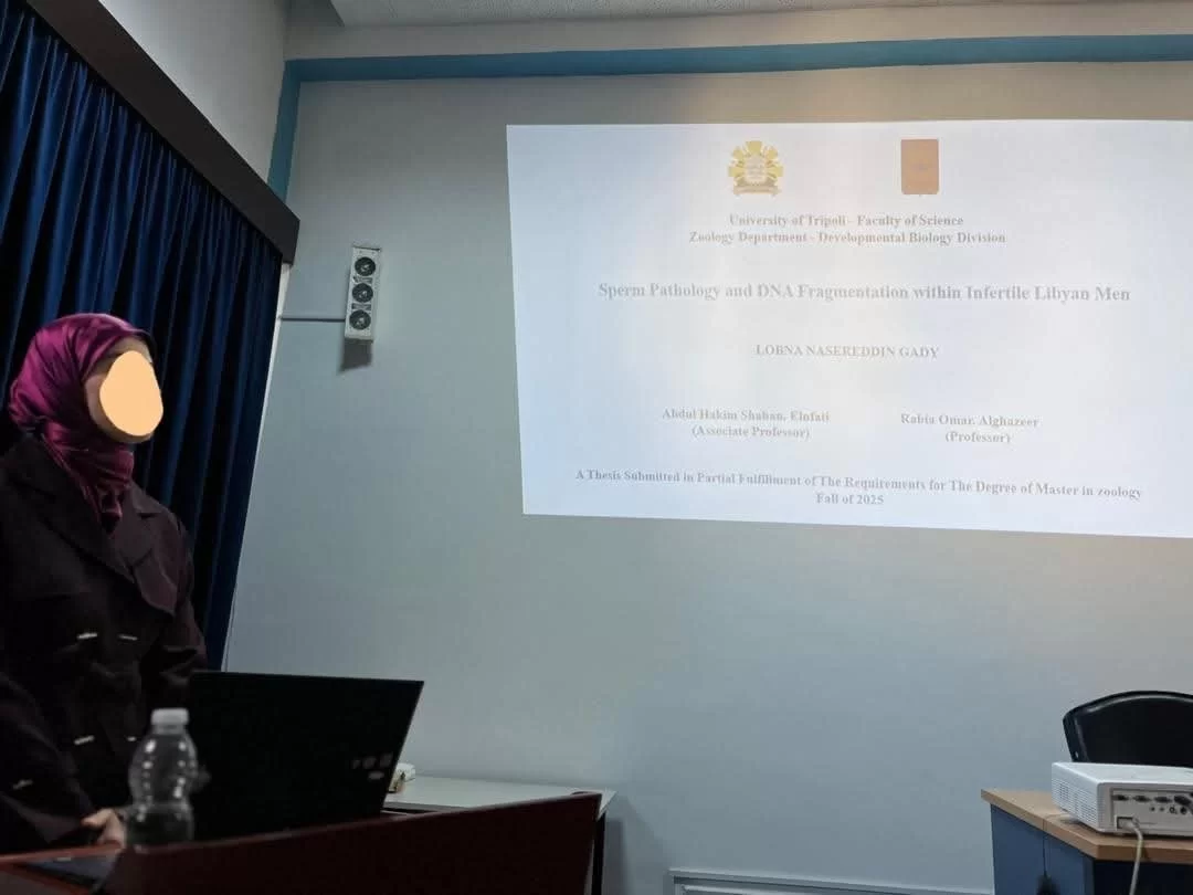 تم أمس الأحد الموافق 26 /2025/10 بفضل الله وتوفيقه مناقشة رسالة الماجستير المقدمة من الطالبة لبنى نصر الدين مصباح القاضي بعنوان " التشوهات الظاهرية وتكسر المادة الوراثية للحيوانات المنوية في الرجال المصاببن بالعقم في ليييا " وكانت لجنة المناقشة مكونة من :