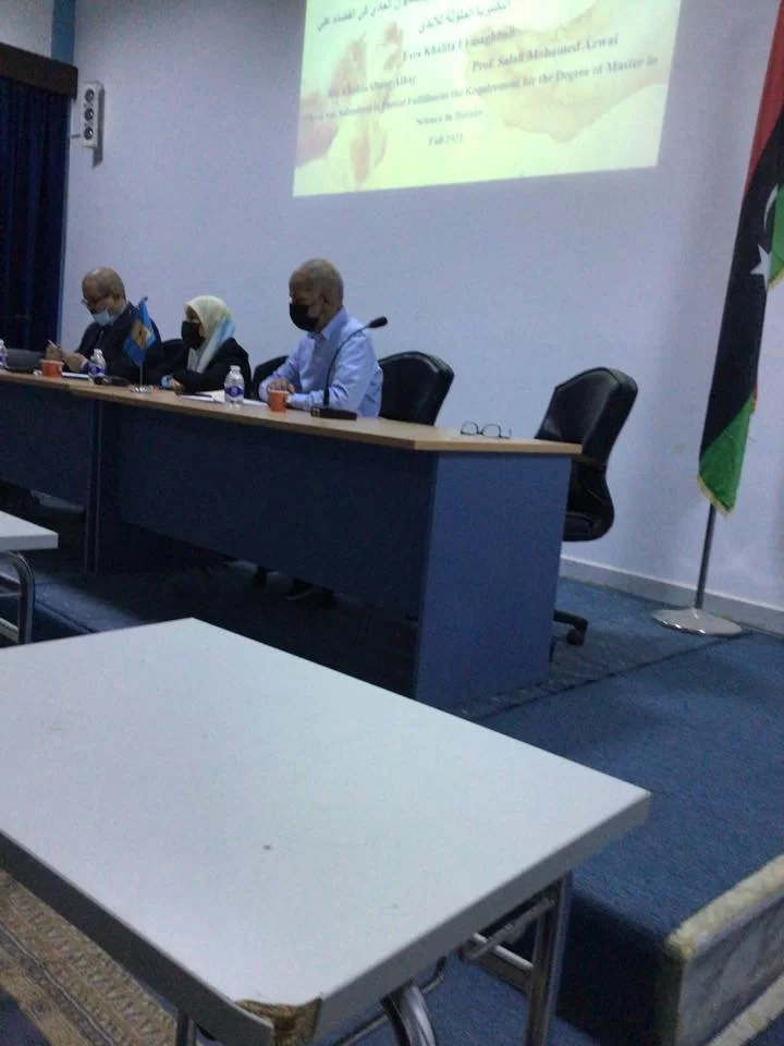 متابعات تم صباح يوم الاثنين الموافق 15/11/2021مناقشه رساله الماجستير بقاعه قسم علم الحيوان للمعيده بقسم علم النبات إسراء خليفه ميلاد المغبوب بعنوان :دراسه مقارنه بين فعاليه الصابون المضاد للبكتيريا والصابون العادي في القضاء على البكتيريا الملوثه للايدي بحضور لجنه المناقشه الخاصه بالرساله في نهايه المناقشه اجازت لجنه المناقشه الرساله ومنحتها تقدير ممتاز