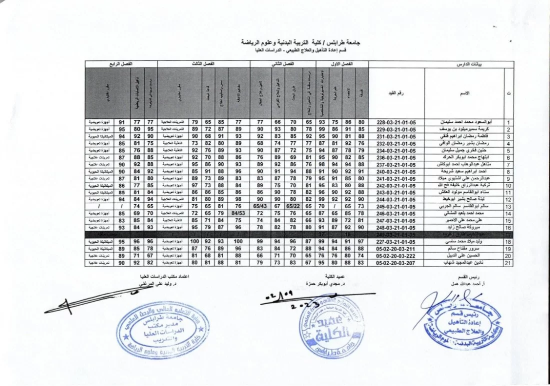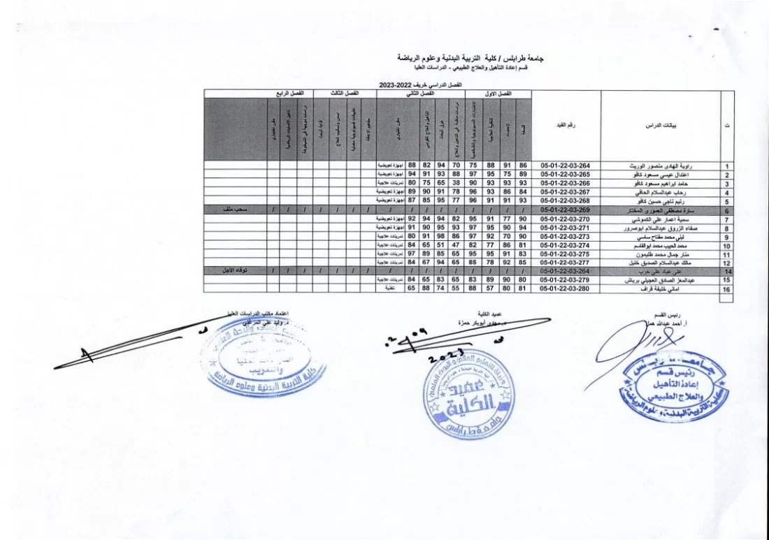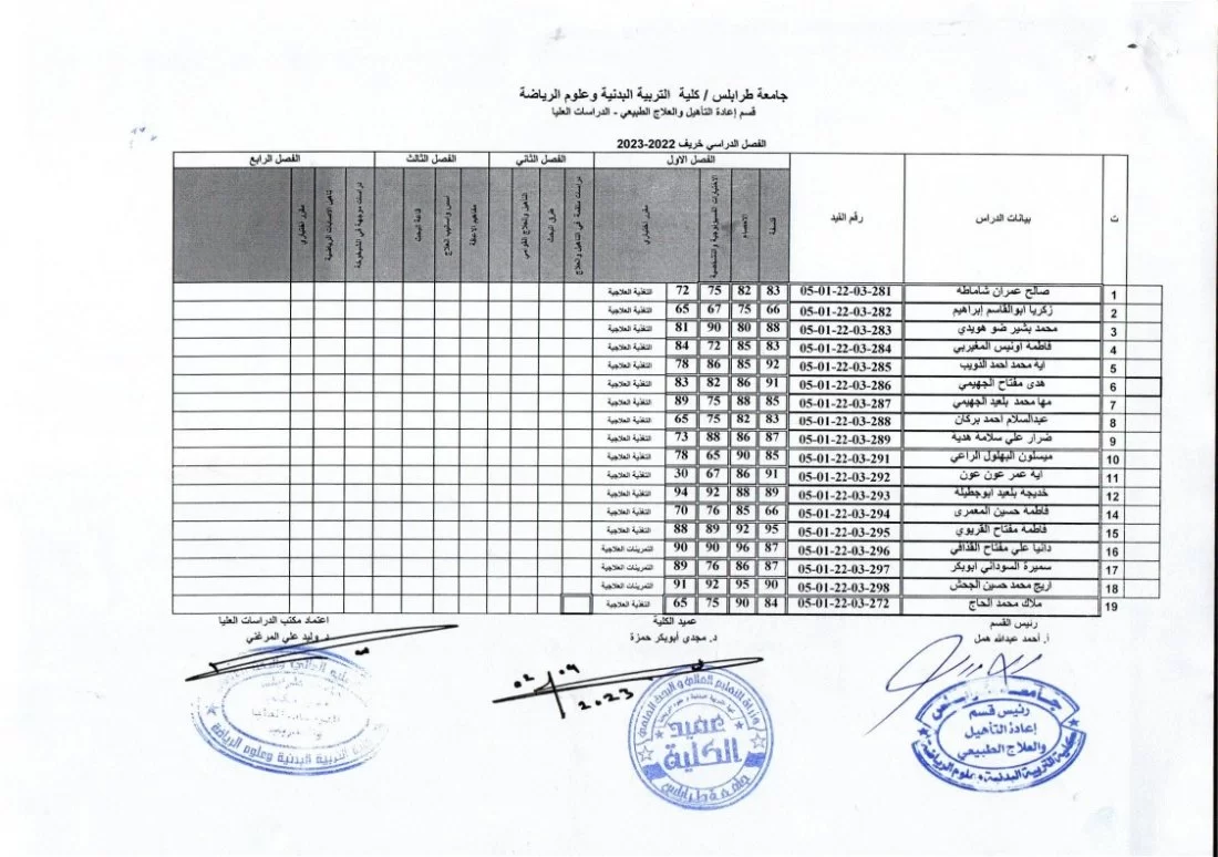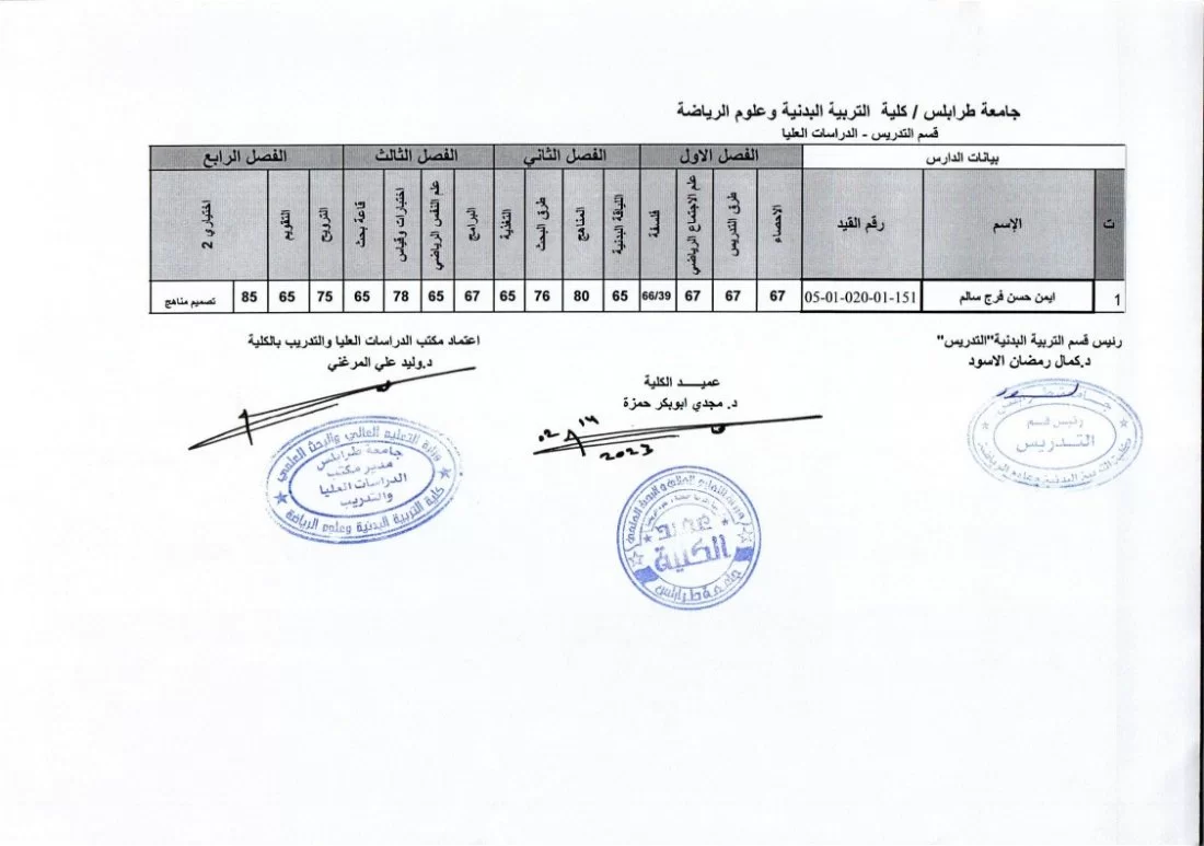 يفيدكم مكتب الدراسات العليا بكلية التربية البدنية وعلوم الرياضة بجامعة طرابلس عن نشر نتائج الامتحانات النهائية لطلبة الدراسات العليا (الماجستير) ولجميع الاقسام الدراسية (التربية البدنية (التدريس) – التدريب – إعادة التأهيل والعلاج الطبيعي)، وذلك لفصل الخريف 2022/ 2023.
