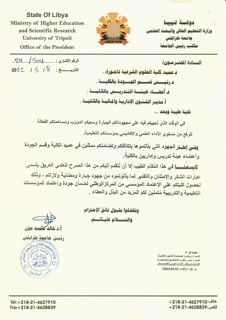 رسالة شكر وتقدير من رئيس جامعة طرابلس الى كلية العلوم الشرعية