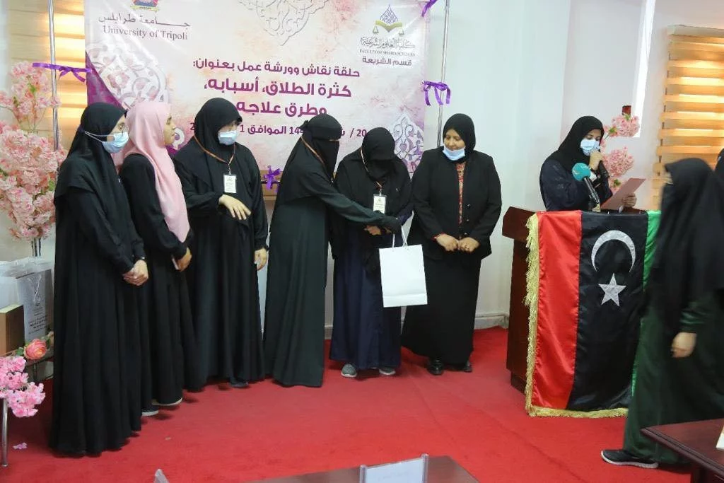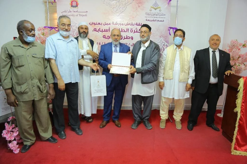 قام قسم الشريعة بكلية العلوم الشرعية بتكريم المشاركين في ورشة العمل وهم : 1- مفتي طرابلس فضيلة الشيخ: أحمد ميلاد قدور.2- الشيخ علي التير مدير مركز الصفا للعلوم القرآنية.3- أ. ناجي الزواوي القاضي بالمحكمة العليا.4- د. أبوبكر أبوسوير عميد كلية جمعية الدعوة الإسلامية.5- أ. طلال الدريبي مدير إدارة مجلس البحوث والدراسات الشرعية بدار الإفتاء.6- د. صالح مصطفى المصراتي الاستشاري في طب الأطفال ، كما تم تكريم طالبات كلية الدعوة الاسلامية المشاركة في ورشة العمل .