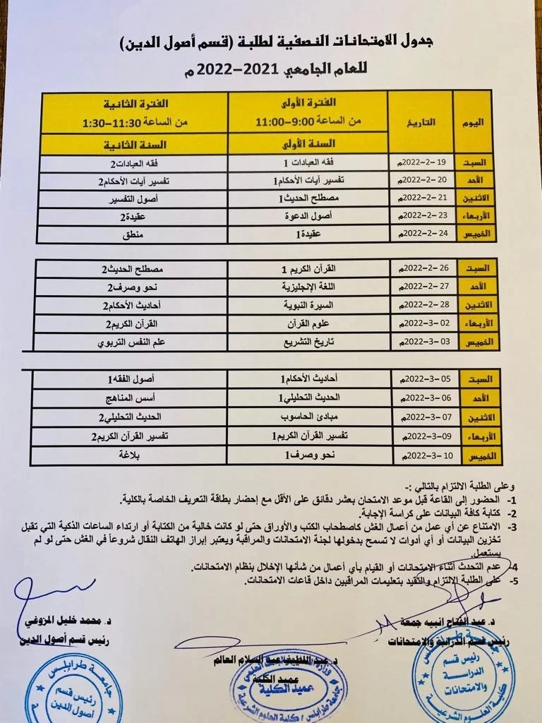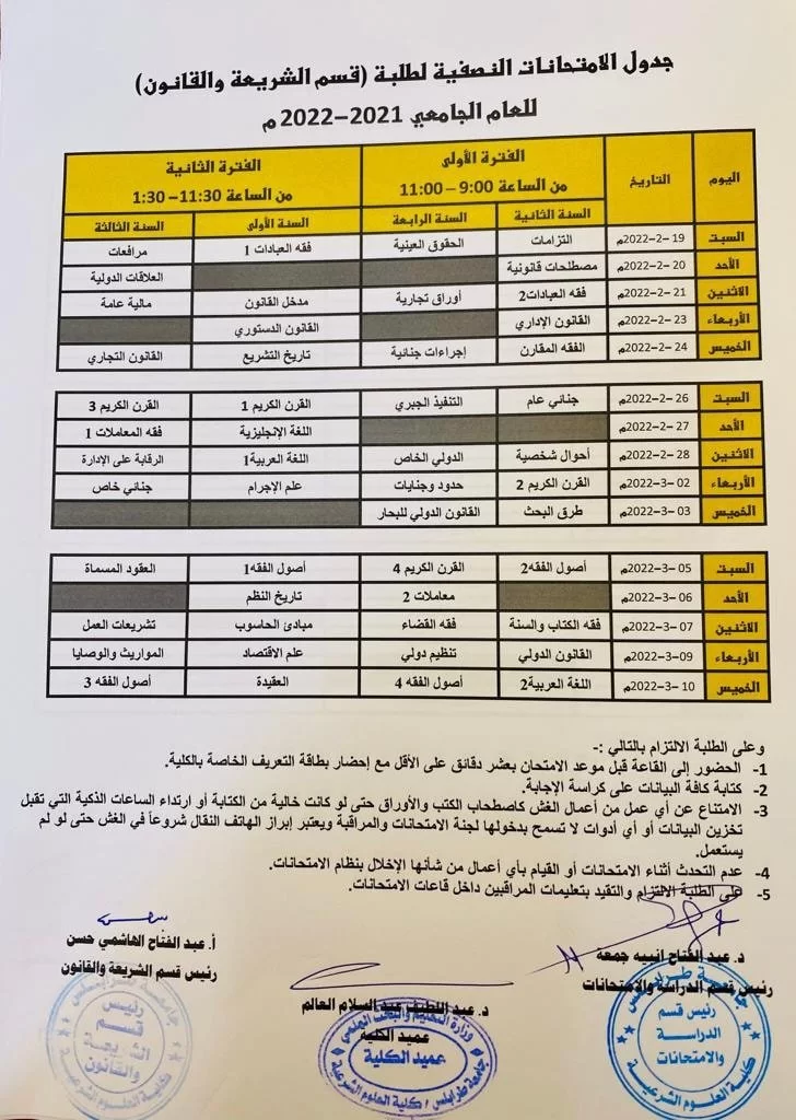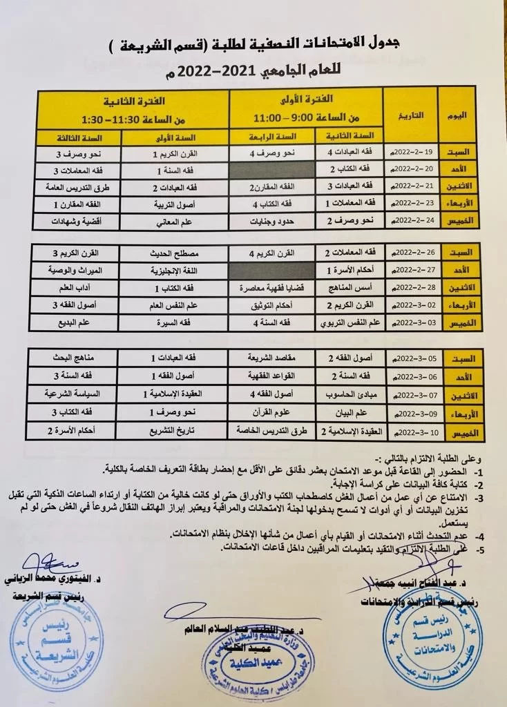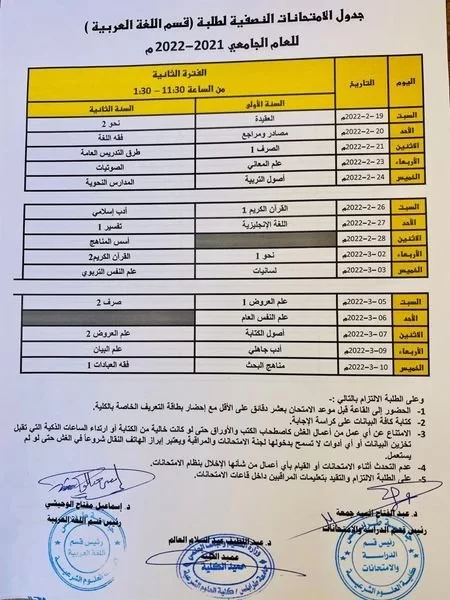 جداول الامتحانات النصفية للعام الجامعي 2022/2021 م لجميع الأقسام العلمية.