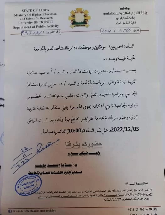 نظراً لظروف خاصه ، سيتم تأجيل انطلاق بطولة كأس طلاب جامعة طرابلس لمدة أسبوع من تاريخ الإعلان.