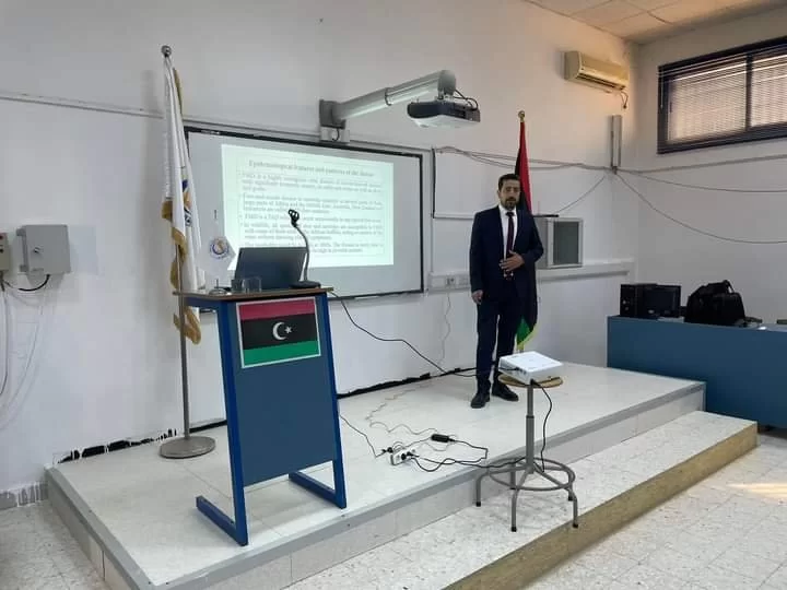 تم صباح اليوم الأربعاء الموافق 6 مارس 2024 بمدرج الدراسات العليا بكلية الطب البيطري بجامعة طرابلس عقد ندوة علمية بخصوص مرض الحمى القلاعية Foot-and-mouth disease - حضرها عدد من أساتذة الكلية و زملائنا الافاضل من المركز الوطني المركز الوطني للصحة الحيوانية و عدد من الأطباء البيطريين و زملائنا الافاضل من هيئة البيئة و الإصحاح البيئي و السلخانات و عدد من المهتمين