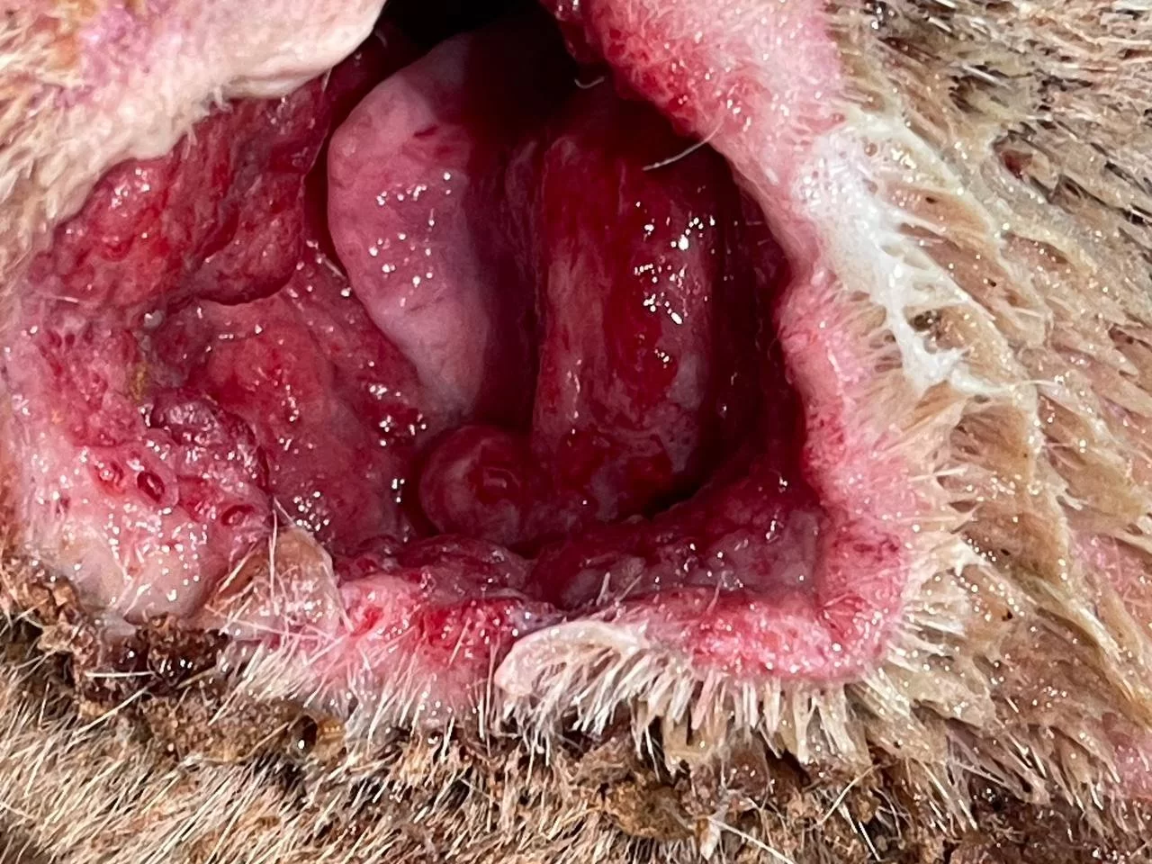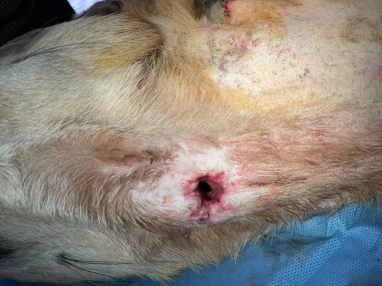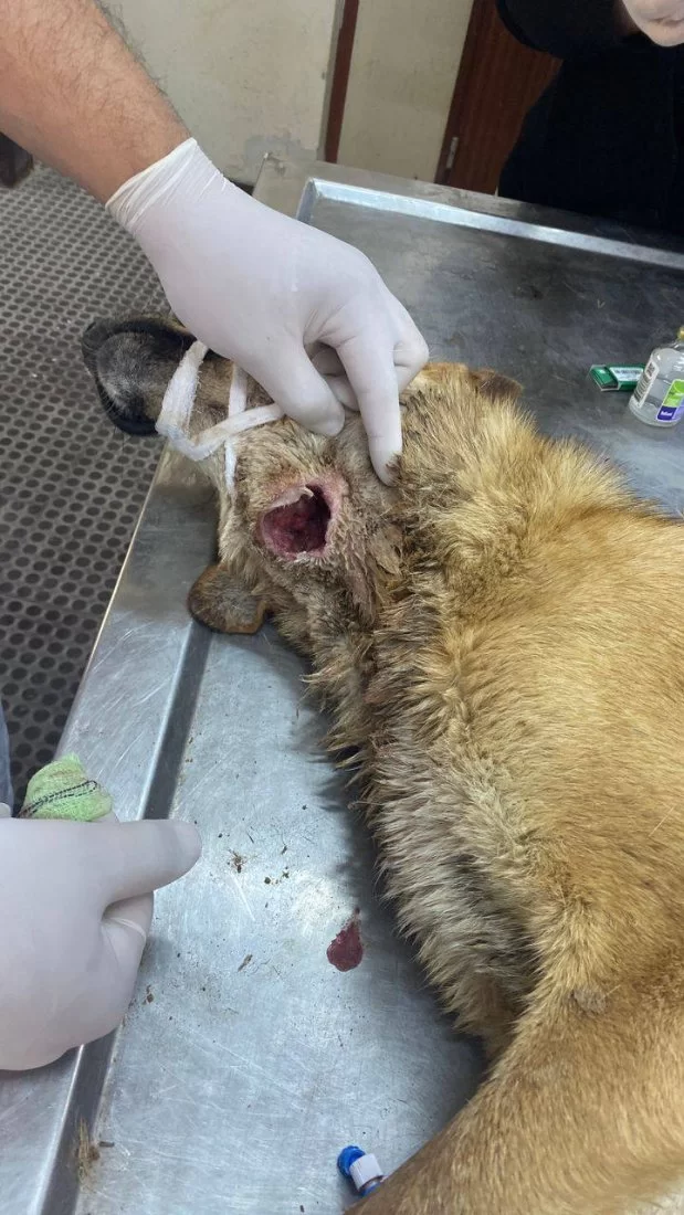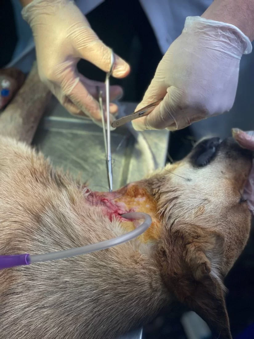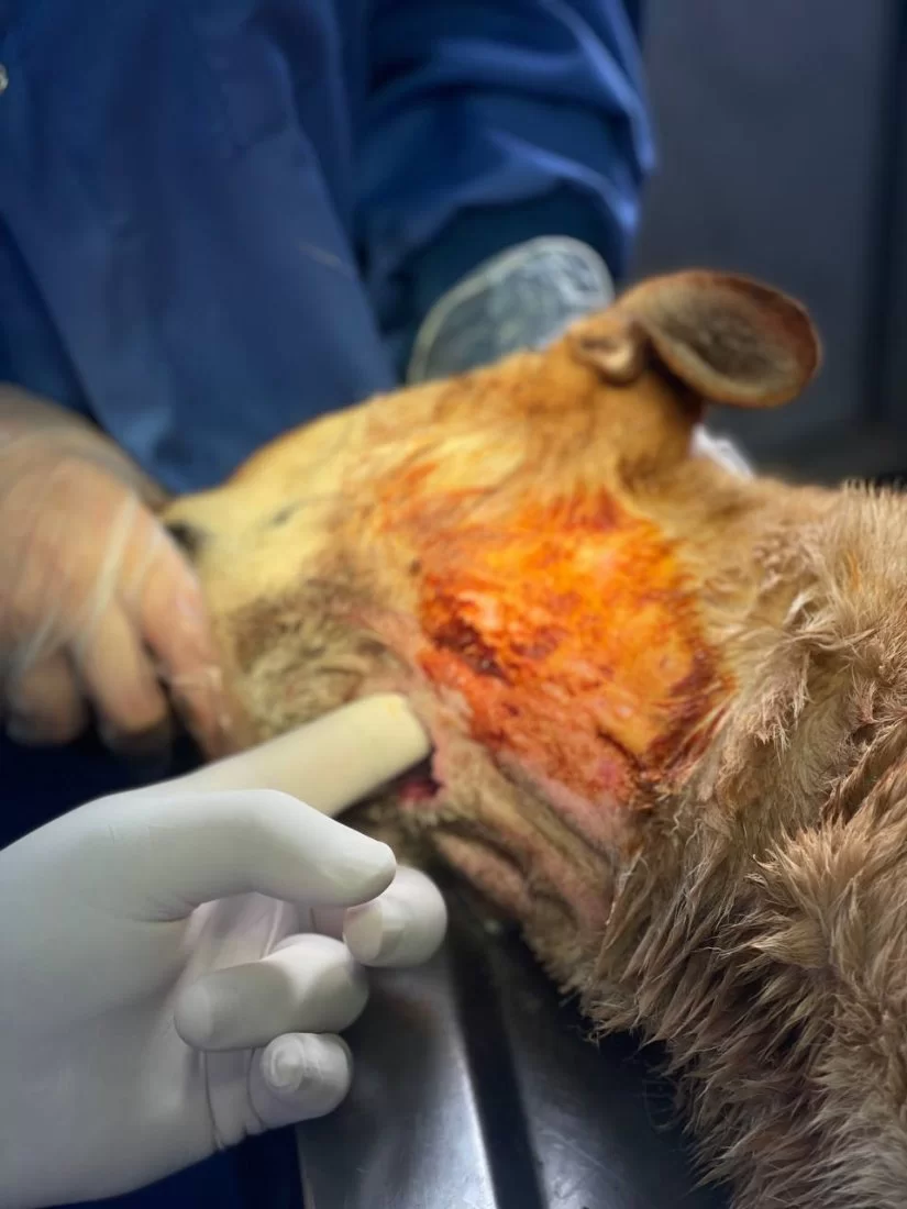 فتح المريء Esophagostomy وادخال انبوب تغذية ( feeding tube) في المريء ( تغيير مسار) لتسهيل عملية تغذية الحيوان وتزويده بالطاقة الازمة ليسترد عافيته دون تعرضه لخطر الاختناق بجزيئات الطعام والماء وايضا لإعطاء فرصة للانسجة المتضررة لتتعافى بشكل اسرع.