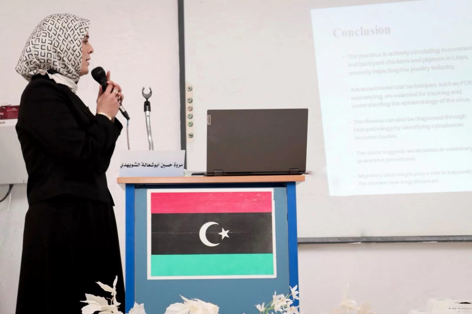 Based on the decision of the University President No. 420 for the year 2025 regarding the formation of a discussion committee for the student Marwa Hussein Al-Shweheidi, enrolled in the high diploma program in poultry diseases, the student presented today the results obtained from the research titled "Studies on the Pox Virus in Chickens and Pigeons in Tripoli, Libya." This took place in the postgraduate hall of the college, in the presence of the appointed committee, represented by Dr. Al-Sadiq Arhouma, Professor of Virology at the Faculty of Science, Al-Zintan University, as an external examiner, and Professor Ibrahim Al-Dughis, Professor of Virology and Immunology at the Faculty of Veterinary Medicine, University of Tripoli, as an internal examiner. The discussion was supervised by Professor Abdulatif Asheg, Professor of Poultry Diseases, as the primary supervisor, and Professor Abdel Wahab Kammon as the assistant supervisor. The committee approved the thesis for the student.