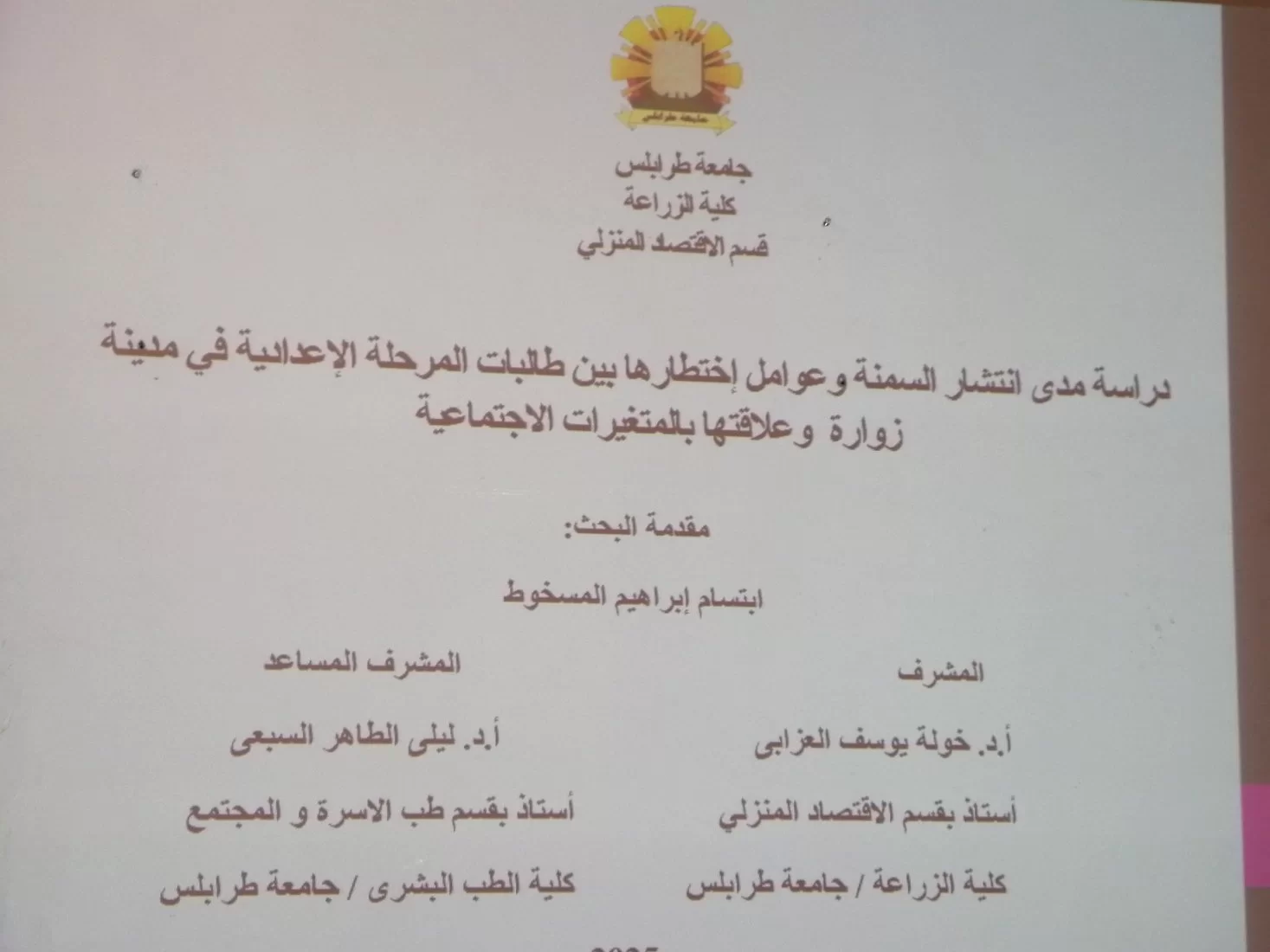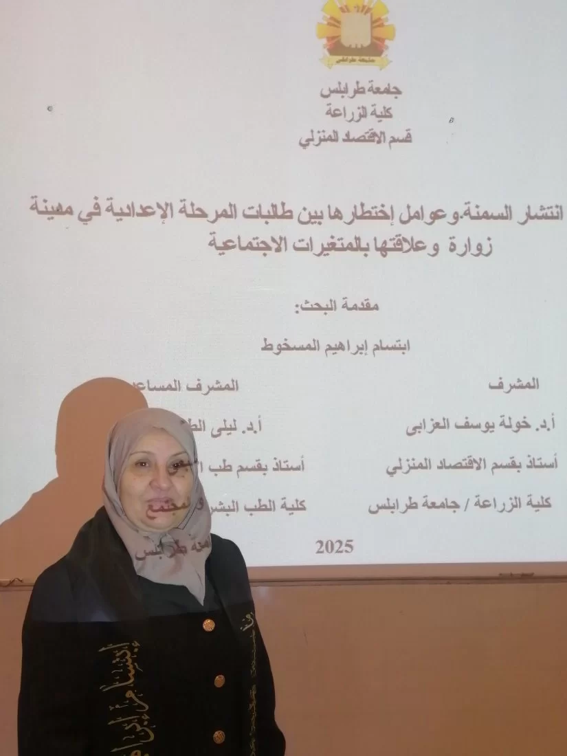 تم بفضل الله مناقشة رسالة ماجستير بعنوان دراسة مدي انتشار السمنة وعوامل اختطارها بين طالبات المرحلة الإعدادية في مدينة زوارة وعلاقتها المتغيرات الاجتماعية من قبل الباحثة(ابتسام ابراهيم المسخوط وتحت اشرف كل من د. خولة يوسف العزابي قسم الإقتصاد المنزلي كلية الزراعة د. ليلي الطاهر السبعي قسم طب الأسرة والمجتمع. كلية الطب البشري جامعة طرابلس