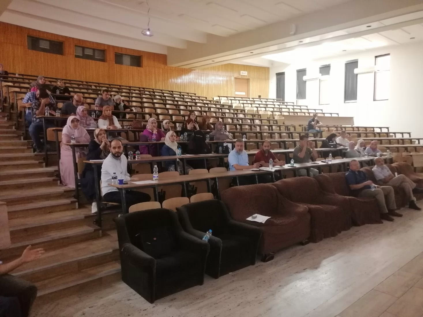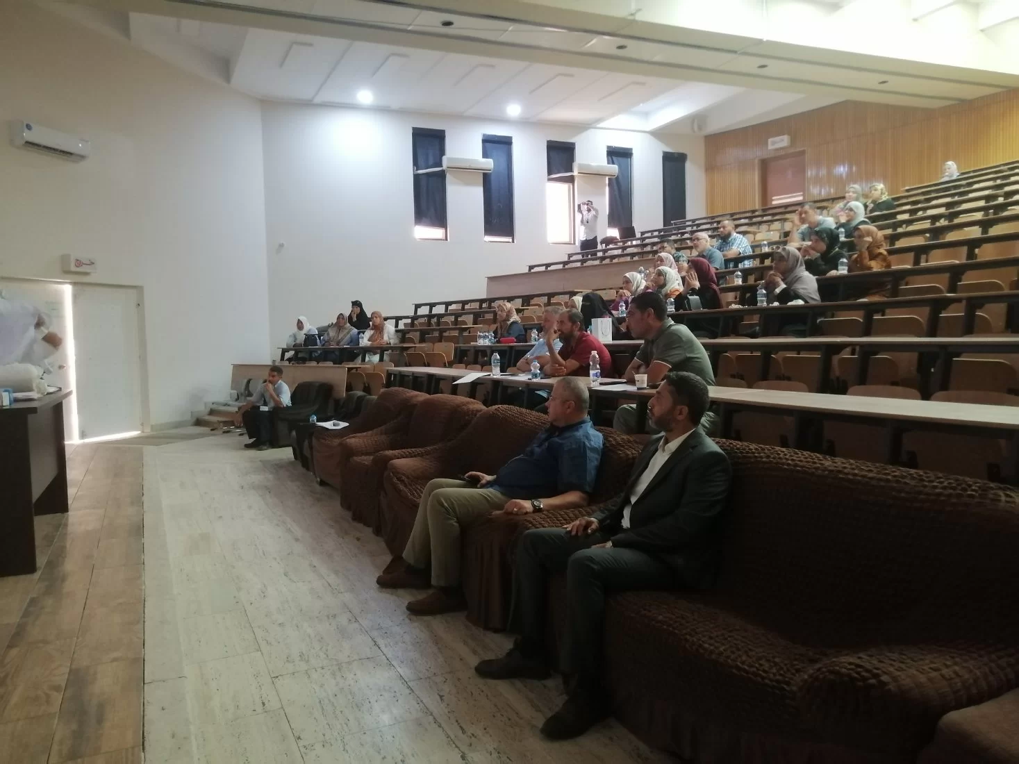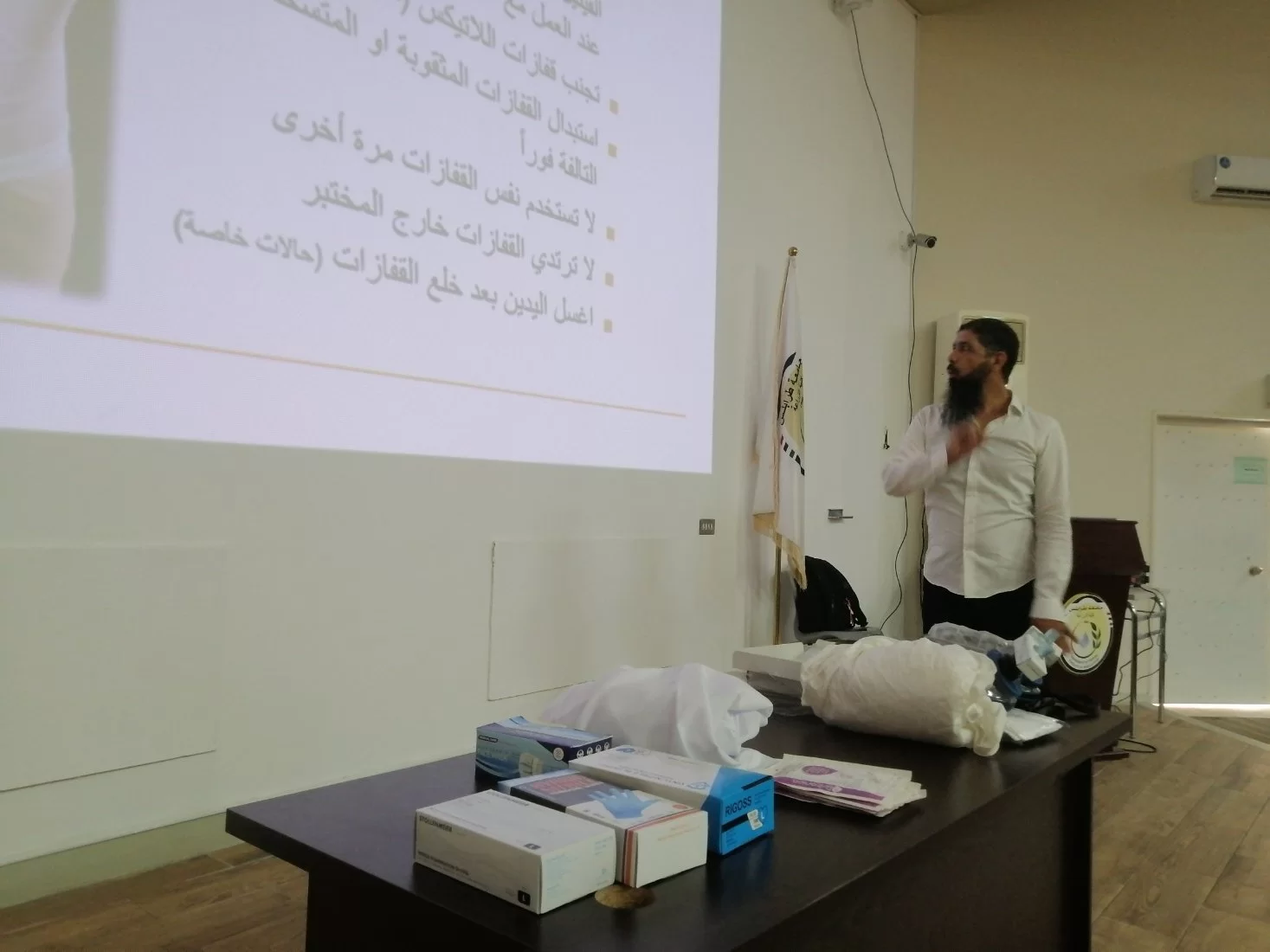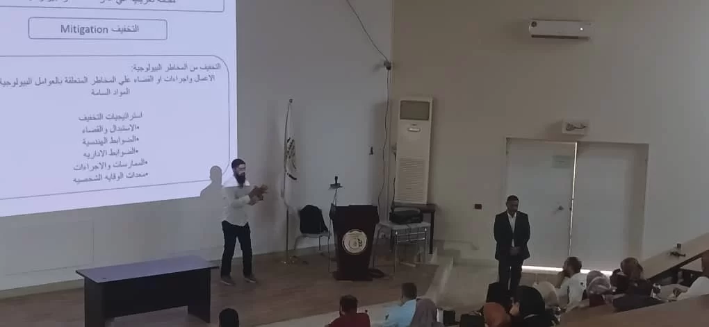 اقام قسم الزراعات المائية بكلية الزراعة بالتعاون مع المركز الوطني لمكافحة الامراض ورشة عمل بعنوان ((ادارة المخاطر البيولجية بالمعامل ))،حيث كانت الفئة المستهدفة منه هذه الورشة هم المهندسين (فنيي المعامل ) والمعيدين بالاقسام العلمية بكلية الزراعة وايضا طلبة الدراسات العليا بالاقسام. حيث نوقش في المحاضرات اليات التعامل مع المخاطر البيولوجية بالمعامل وكيفية ادارة المخاطر بها وكذلك طرق التقليل منها، وفي النهاية تم شرح طرق استعمال ادوات الوقاية الشخصية وكيفية استخدامها في المعمل. كانت الورشة بحضور عميدة كلية الزراعة أ.د. هيفاء دوزان ورئيس قسم الزراعات المائية أ. علي ابوسليانة واعضاء هيئة التدرسي والموظفين بالقسم وبحضور د.عبد الحميد الشريف من المركز الوطني لمكافحة الامراض، وايضا المهندسين والمعيدين وطلبة الدراسات العليا بالكلية.