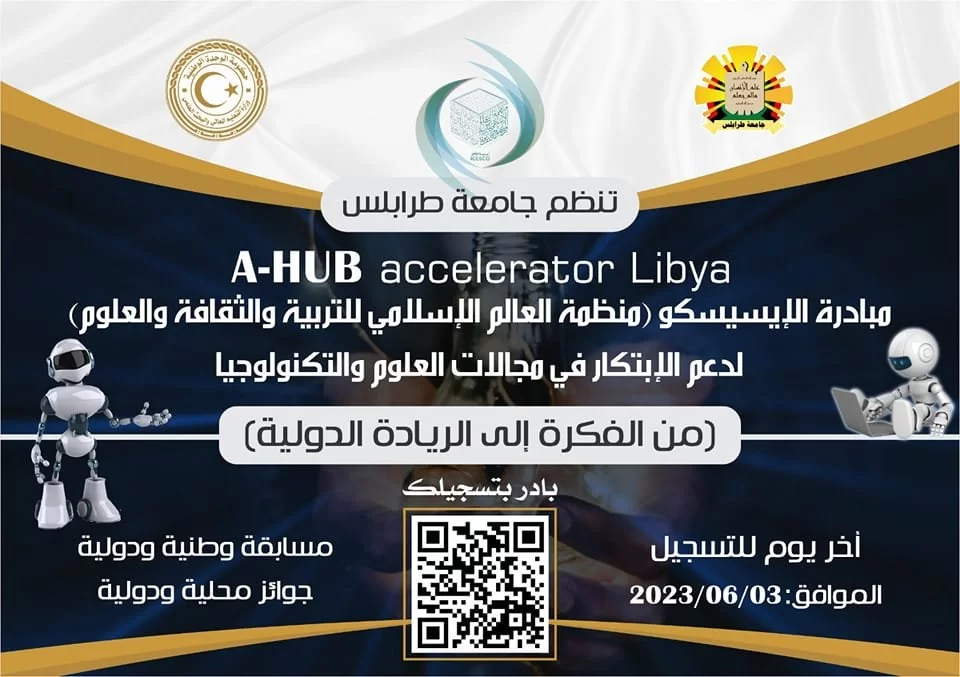 تنفذ جامعة طرابلس المسابقة الوطنية A-HUB الخاصة بمسرع ريادة الاعمال وذلك بالتعاون مع منظمة العالم الاسلامي للتربية والعلوم والثقافة (الإيسيسكو). ستشارك المشاريع المحلية المتميزة والفائزة فى مسابقة اقليمية للمنافسة مع المشاريع المتميزة من دول مختلفة من اعضاء منظمة الايسيسكو. هذه دعوة لكافة اصحاب ا