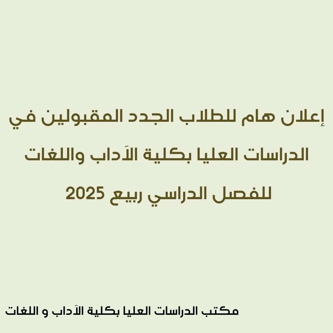 إعلان هام للطلاب الجدد المقبولين في الدراسات العليا بكلية الآداب واللغات للفصل الدراسي ربيع 2025