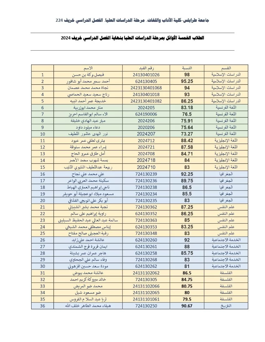 الطلاب الخمسة الأوائل بمرحلة الدراسات العليا بنهاية الفصل الدراسي خريف 2024