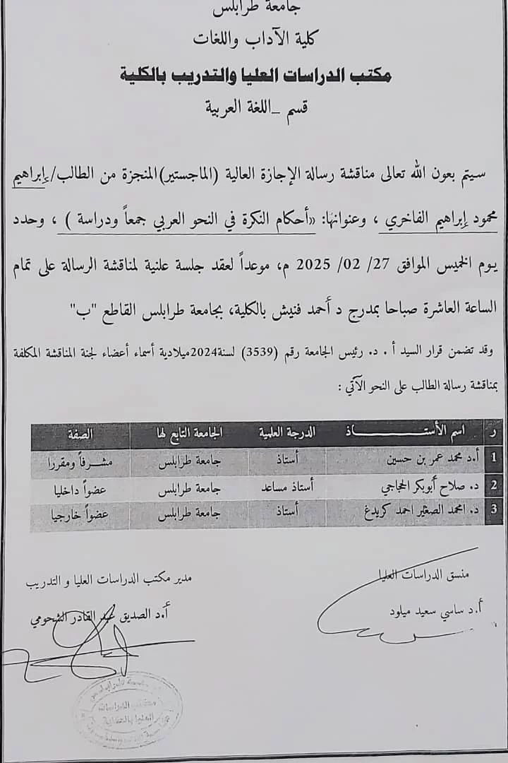 ستناقش بعون الله تعالى يوم الخميس الموافق 27/02/2025 علي تمام الساعة العاشرة صباحا بمدرج د. احمد فنيش بجامعة طرابلس القاطع ب ،رسالة الإجازة العالية الماجستير المنجزة من الباحث إبراهيم محمو