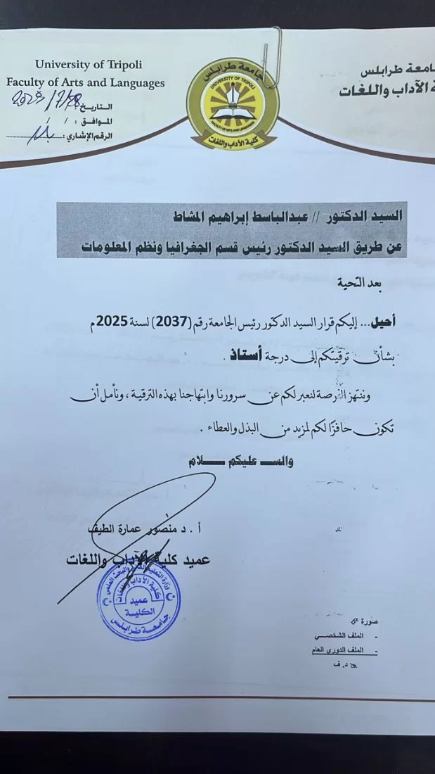 تتقدم عمادة كلية الآداب واللغات بجامعة طرابلس بأسمى آيات التهنئة والتقدير إلى: