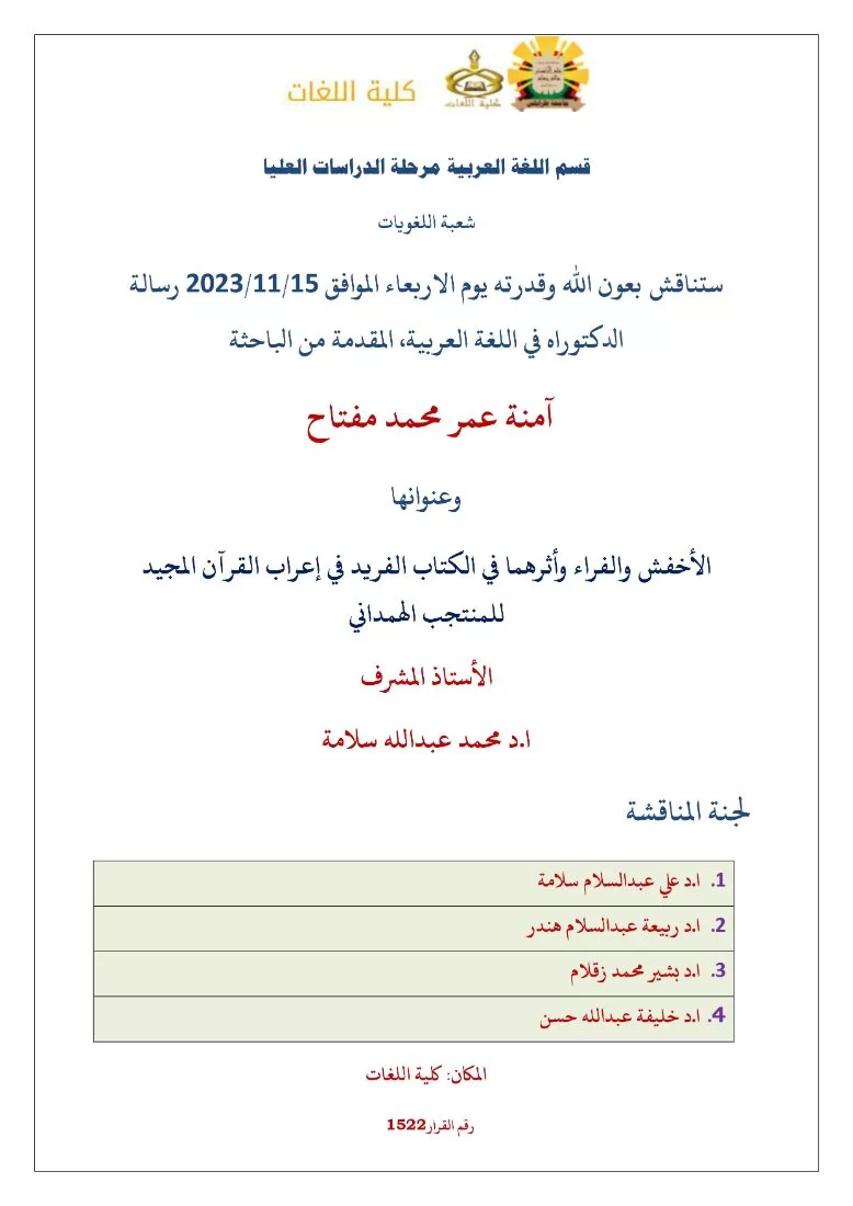 ستناقش بعون الله وقدرته يوم الاربعاء الموافق 15/11/2023 رسالة الدكتوراه في اللغة العربية، المقدمة من الباحثةآمنة عمر محمد مفتاح