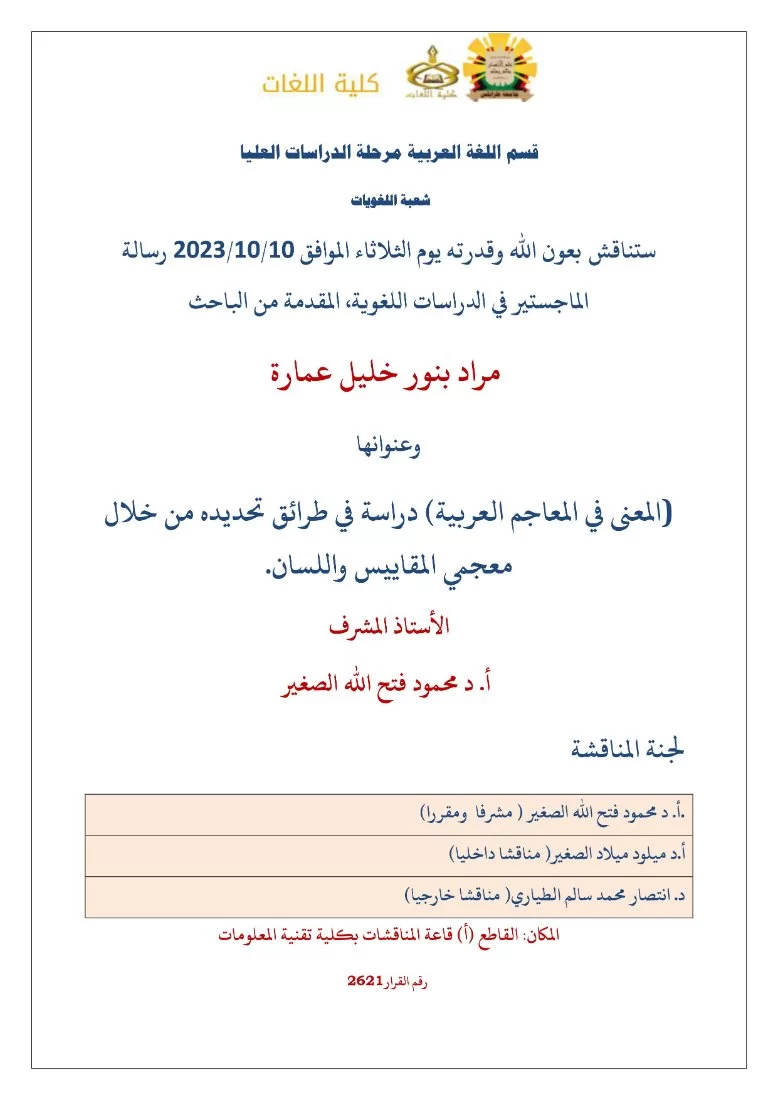 قسم اللغة العربية مرحلة الدراسات العليا شعبة اللغويات ستناقش بعون الله وقدرته يوم الثلاثاء الموافق 10/10/2023 رسالة الماجستير في الدراسات اللغوية، المقدمة من الباحث مراد بنور خليل عمارةوعنوانها(المعنى في المعاجم العربية) دراسة في طرائق تحديده من خ