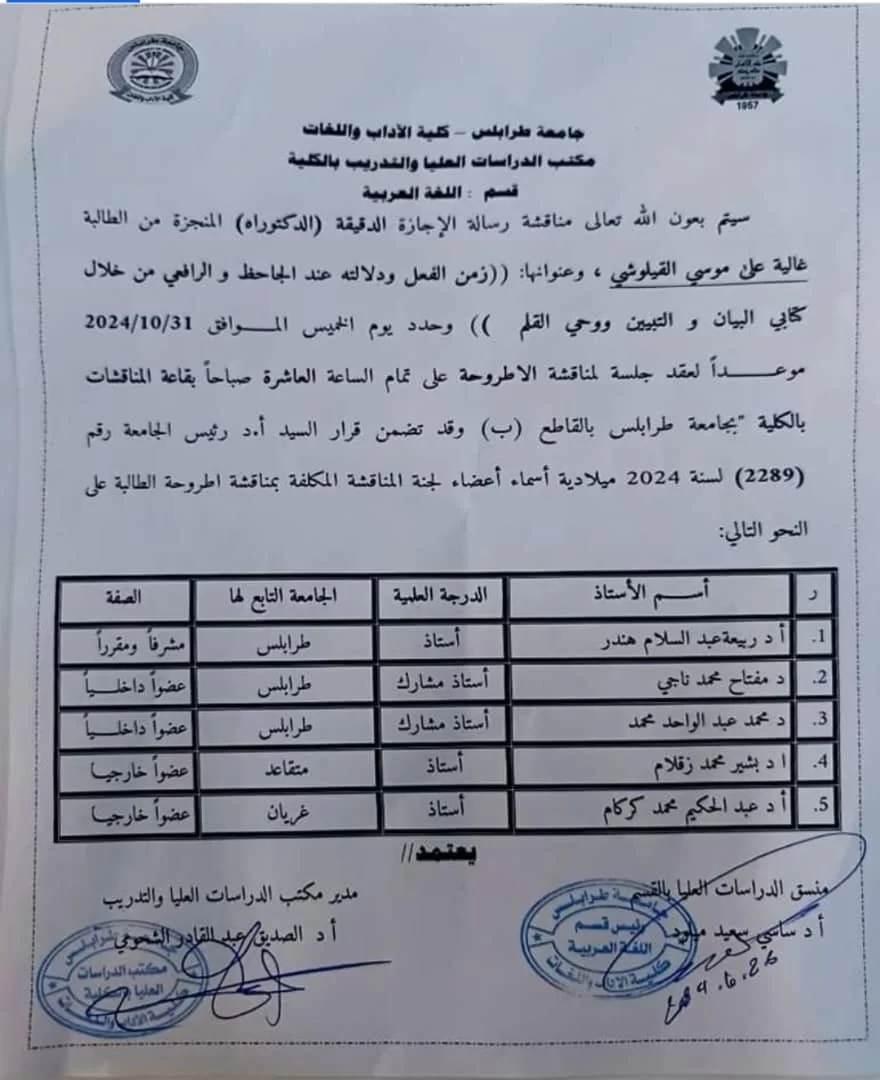 مناقشة رسالة الاجازة الدقيقة الدكتوراه في اللغة العربية -كلية الآداب واللغات للباحثة غالية على موسي القليوشي