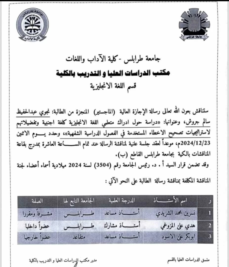ستناقش بعون الله وقدرته يوم الخميس الموافق 31/10/2024 رسالة الدكتوراه في اللغة العربية، المقدمة من الباحثة