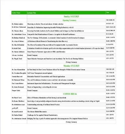 اقامة المؤتمر الدولي الثالث لطب و جراحة الفم و الاسنان و المعرض المصاحب، و ورش العمل التخصصية خلال الفترة من الى 16/12/2025-14، و قد شهد المؤتمر حضورا لافتا و متميزا نظرا لإحتوائه علي عدد كبير من المحاضرات و الأوراق البحثية المحلية و الدولية من إيطاليا و انجلترا و الإمارات العربية .. هذا و قد خلص المؤتمر لمجموعة من التوصيات و هي: 1-العمل علي مواكبة التطور الحاصل في كل مجالات طب و جراحة الفم و الاسنان بتخصصاته المختلفة.