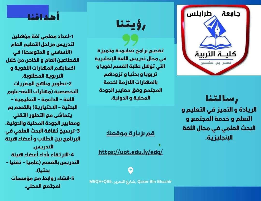 في 22 سبتمبر، نظمت كلية التربية بقصر بن غشير لقاءً تعريفياً مميزاً مع الطلبة الجدد، حيث أتيحت لقسم اللغة الانجليزية الفرصة لتعريف الطلبة الجدد بالبرنامج الأكاديمي للقسم . تم توزيع المطويات التعريفية عن القسم، والتي تحتوي على معلومات البرنامج الأساسية من رؤية و رسالة و أهداف و متطلبات الالتحاق بالقسم.