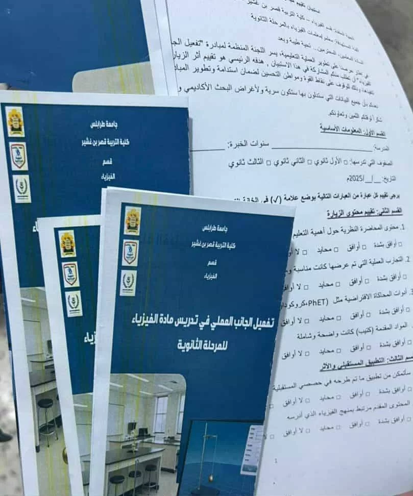 في إطار تنفيذ مبادرة تفعيل الجانب العملي في تدريس مادة الفيزياء للمرحلة الثانوية قام قسم الفيزياء بكلية التربية قصر بن غشير اليوم الخميس بتاريخ 13-11-2025 بزيارة إلى مدرسة التحرير للتعليم الأساسي والثانوي، وتهدف هذه الزيارة الي تفعيل المبادرة و التعريف بالتقنيات التعليمية الحديثة في تدريس الجانب العملي لمادة الفيزياء مثل تقنية المعامل الافتراضية.هذا ويشكر قسم الفيزياء إدارة ومعلمات مدرسة التحرير على حسن الاستقبال والتفاعل الإيجابي الذي من شأنه أن يساهم في تطوير العملية التعليمية.