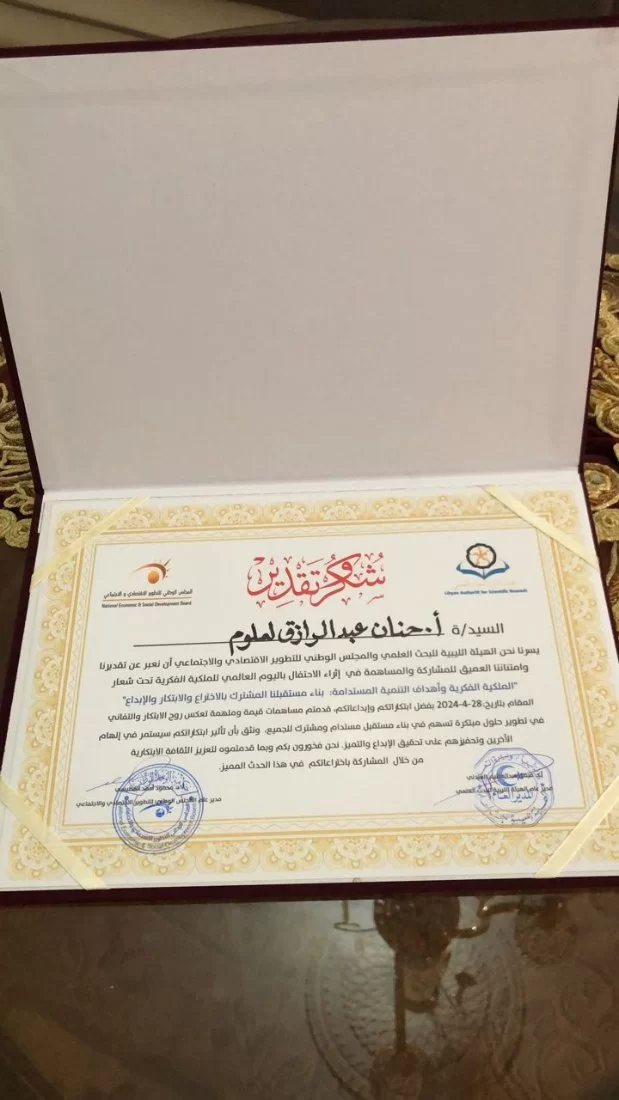 في إطار التميز والرقي لاعضاء هيئة تدريس في أقسام الكلية تم تكريم دكتورة حنان لملوم من قسم معلم فصل في اليوم العالمي للملكية الفكرية على مجهوداتها تميزها في الابتكار والابداع الفكري