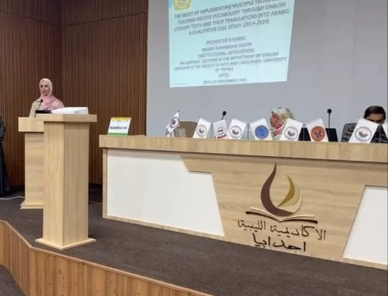 نظراً لأهمية البحث العلمي قام ثلاثة من أعضاء هيئة التدريس بقسم اللغة الانجليزية بكلية التربية جنزور بالمشاركة في المؤتمر العلمي العالمي الأول حول "واقع وآفاق طرق تدريس ونظريات تعلم اللغات الحيّة والترجمة في الجامعات والمؤسسات الاكاديمية العربية" المنعقد في جامعة بنغازي واكاديمية الدراسات العليا اجدابيا في الفترة من 25- 28 نوڤمبر 2024 حيث قدم الأساتذة الورقات العلمية التالية: