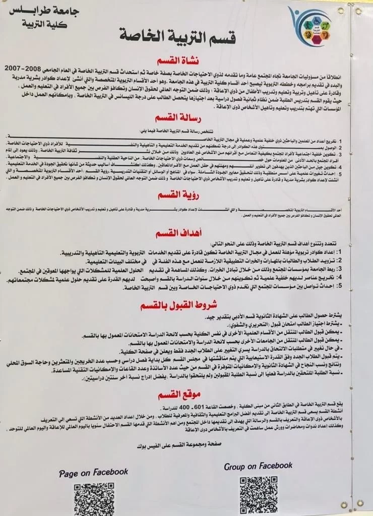 قسم التربية الخاصة... وعبارات خرجت من رحم الإنسانيةبقلم: فتحي الفاضليعبارة من أصدق العبارات تقول: "معلم التربية الخاصة مختلف، فهو أذن من لا يسمع، وعين من لا يبصر، وصوت من لا يتكلم، وعقل من لا يُدرك."، وهذه حقيقة دامغة وواقع ملموس، أتفق مع هذه المقولات دون تردد.و