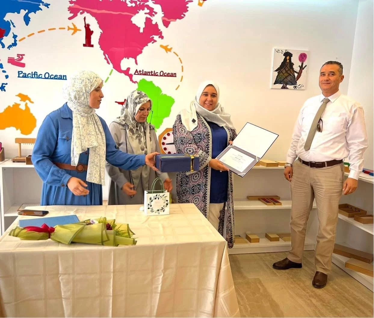 اختمت صباح اليوم فاعليات الدورة التدريبية لطالبات قسم التربية الخاصة بروضة مرح المونتسوري بحضور كل من وكيل الكلية د. نجاة القاضي ود. ابراهيم الذويبي مدير شؤون اعضاء هيئة التدريس و د. نجاح الطبيب رئيس قسم التربية الخاصة ود. فاطمة بن عثمان ود فاطمة المقرحي و د. فوزية الكيش و المعيدة فاطمة الم