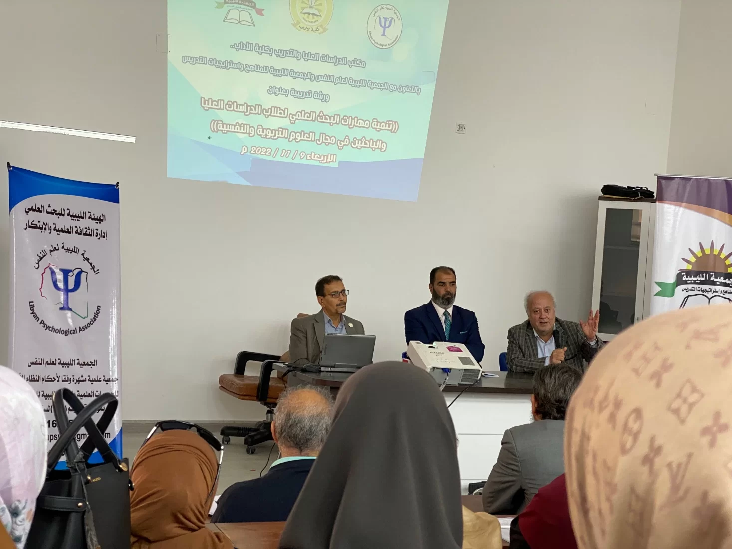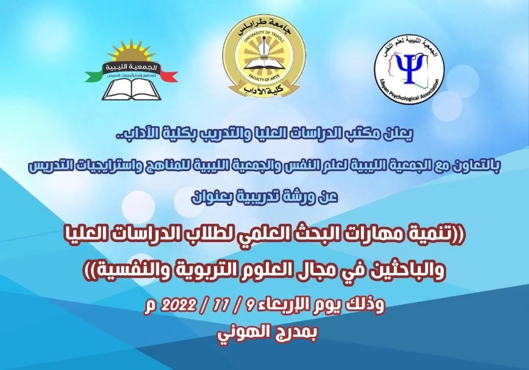 اقيمت صباح اليوم بجامعة طرابلس بمدرج الهوني الورشة التدريبية التي اعدها كل من مكتب الدراسات العليا والجمعية الليبية لعلم النفس والجمعية الليبية للمناهج واسترتجيات التدريس بعنوان تنمية مهارات البحث العلمي لطلاب الدراسات العليا والباحثين في مجال العلوم التربوية والتفسية