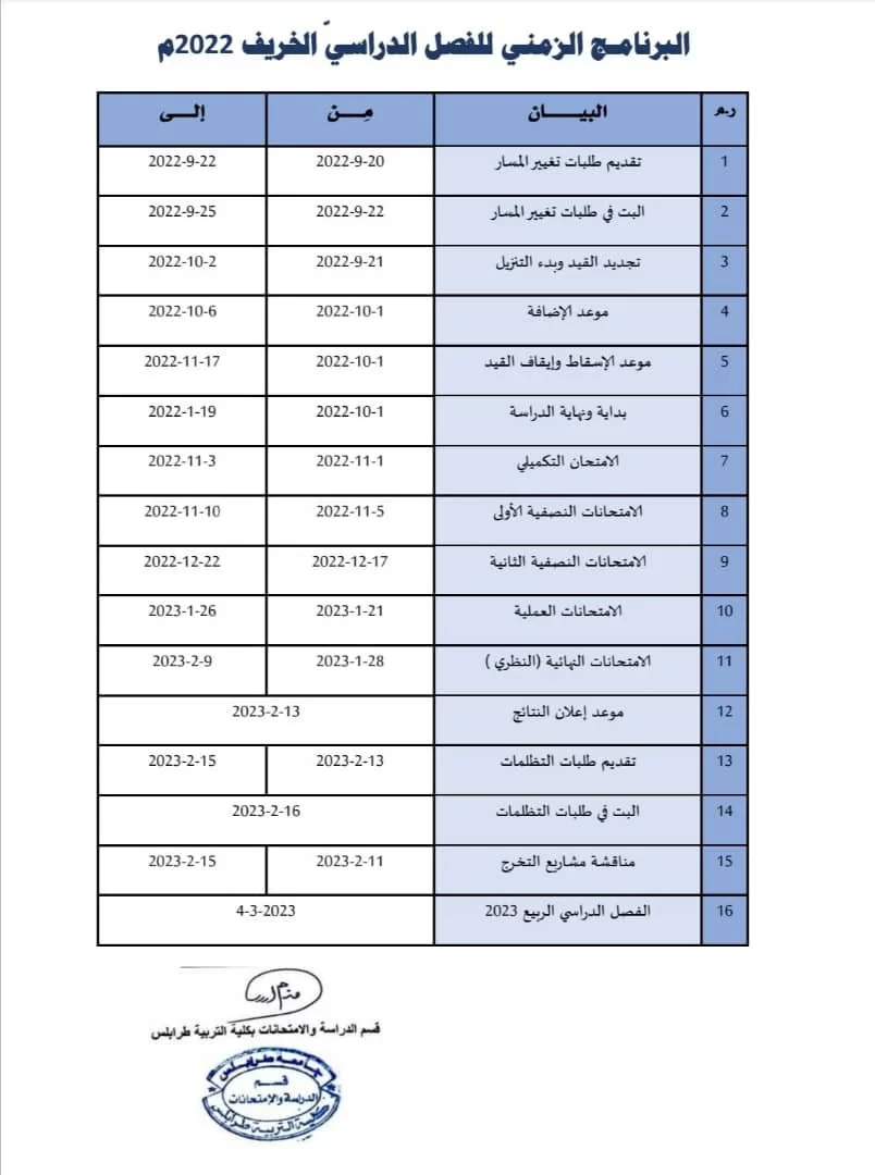 الجدول الزمنيّ للفصل الدراسيّ الخريف 2022وفق الله الجميع