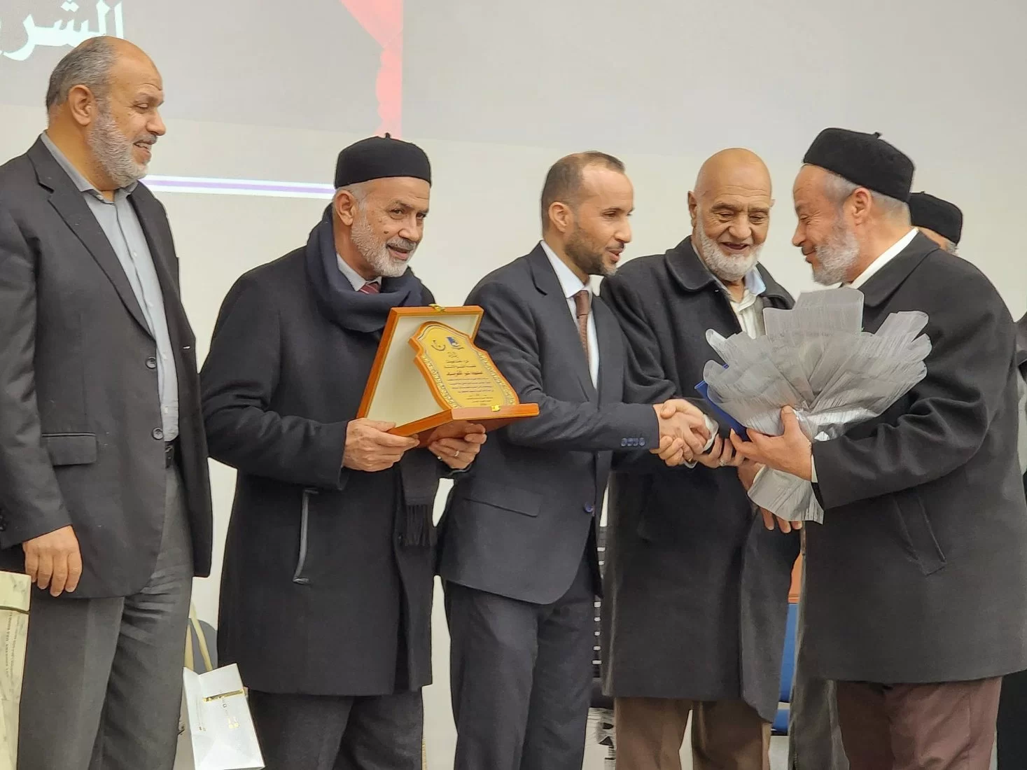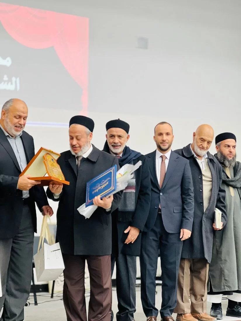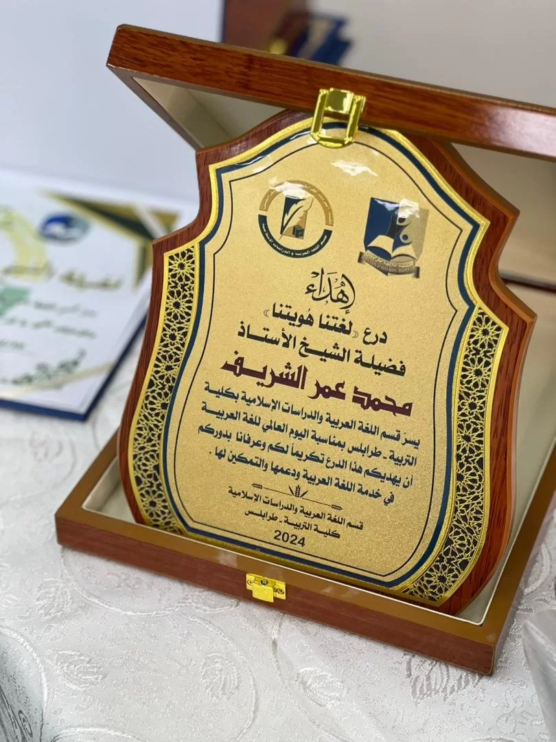 تلتها تكريم الشخصية المتميزة والمرموقة بالقسم الشيخ الأستاذ (محمد عمر الشريف) أستاذ الشريعة بالقسم ،على عطائه المستمر والدؤوب للقسم وطلابه .وإلقاء أبيات بحق الدكتورمحمد من كلمات الشاعر علي البهلول.