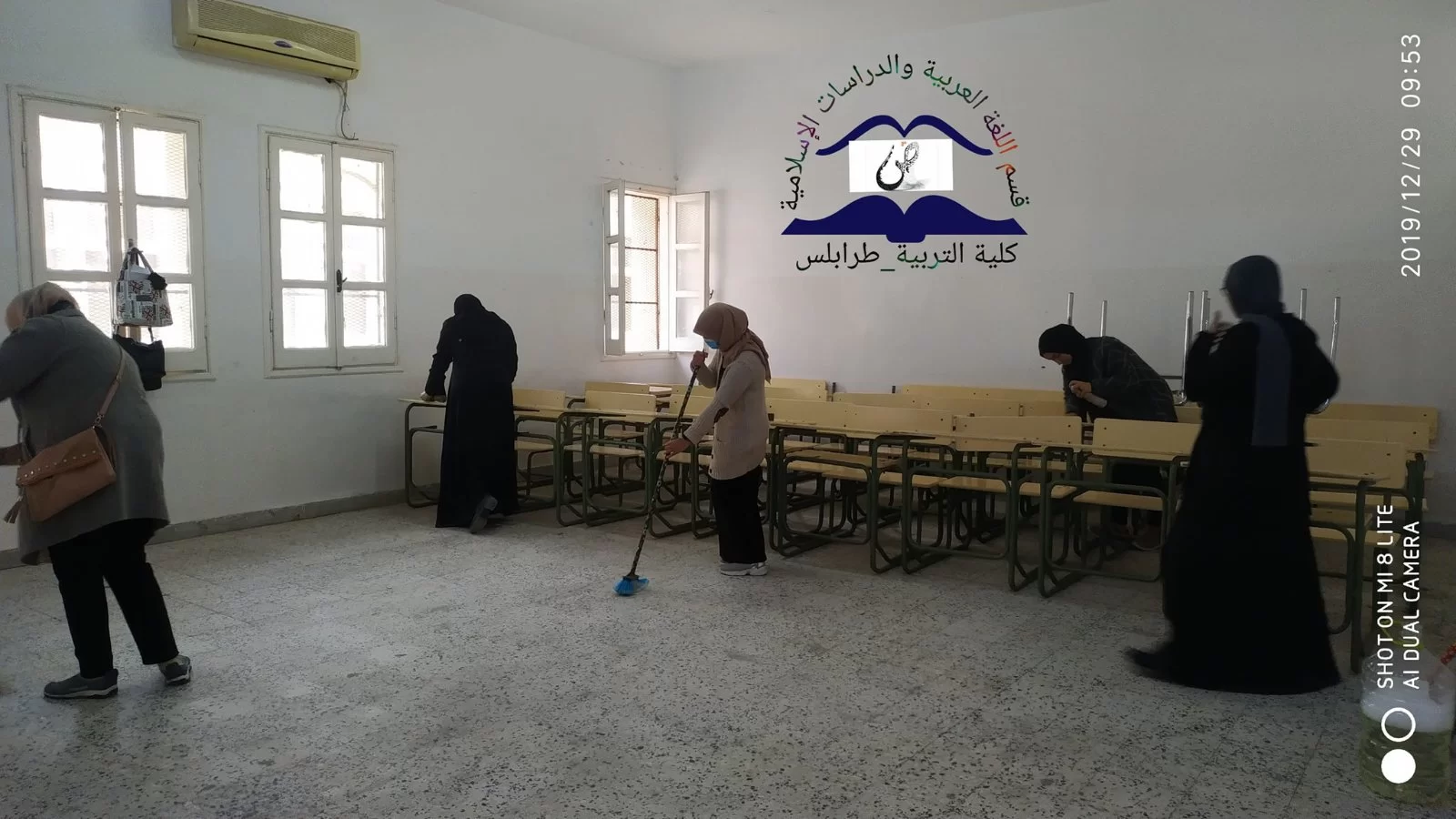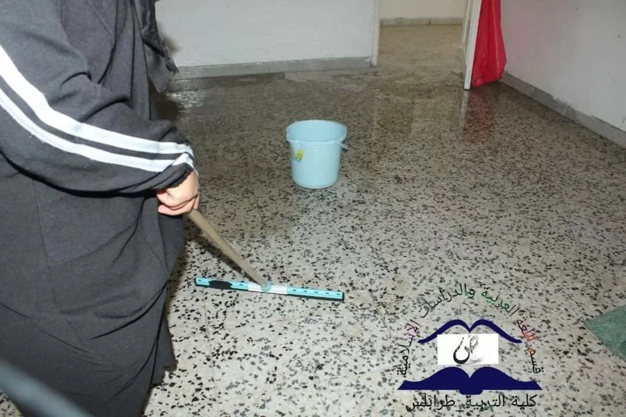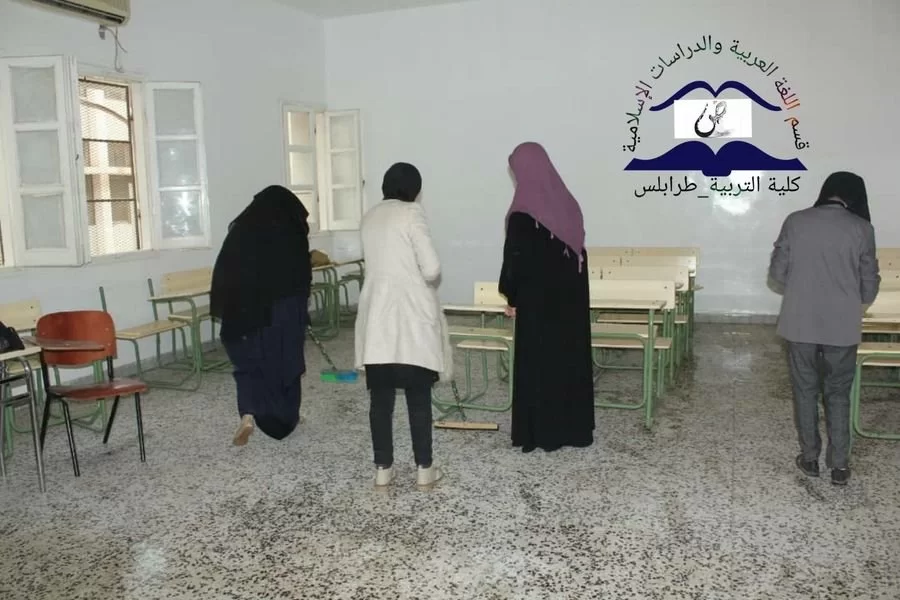 نظم قسم اللغة العربية والدراسات الإسلامية بكلية التربية طرابلس ، والإشراف أساتذة القسم ، حيث لاقت هذه الحملة إقبالا كبيرا لدى الطلبة والأساتذة ، فضلا عن السادة رؤساء الأقسام ، بدا مساعي الحملة على الساعة التاسعة والنصف صباحا ، وانطلقت الأشغال بجد وتفان جو بهيج ملؤه التآخي والتعاون والنشاط ، وهم يعملون كخلية نحل من أجل نظافة بيتهم الثاني وهي ألا وهي كليتهم. حملة التنظيف هذه استهدفت أروقة القسم ، بدءاً بالقاعات الدراسية وتنظيف أرضية القاعات والجدران والجلوس الخاصة بهم والممرات وانتهاءً بمكتب القسم ، وتأتي هذه الأعمال انسجاماً مع توجيهات القسم ، وحثهم المتواصل ، للقيام بالأعمال التطوعية البناءة فهي من توصيات ديننا الحنيف ، كونها تنمي روح العمل الجماعي بين الأسرة التربوية والطلبة وبناء بذرة المسؤولية لدى الطلاب.