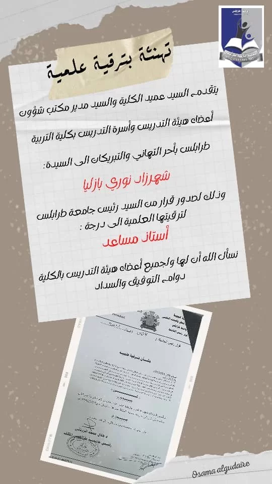 يتقدم السيد عميد الكلية والسيد مدير مكتب شؤون أعضاء هيئة التدريس وأسرة التدريس بكلية التربية طرابلس بأحر التهاني والتبريكات الى أعضاء هيئة التدريس الذين صدر في حقهم قرار من السيد رئيس جامعة طرابلس لترقيتهم العلمية.