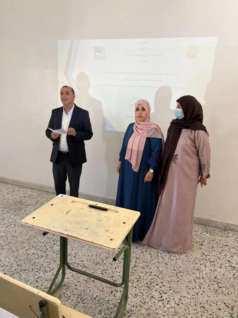 نجوما تلألأت في سماء كلية التربية طرابلس فعكست بريقها فأضاءت قلوباً واشرقت ثَّغْر امهات واباء ينتظرو لحظات سماع تفوق بناتهن ونجاحهن فى ختام مسيرتهن العلمية وبهذا نفاخر الدنيا بأكملها بترك بصماتنا الواضحة بتفوقهن وهذا دليل عظيم عطائنا... احتفل قسم الاحياء امس الخميس الموافق 18 / 4 / 2024 بمناقشة مشاريع تخرج نخبة من طالبات القسم اللاتى انهن بحث تخرجهن للفصل الدراسي خريف 2023 بأشراف الكادر التدريسي بالقسم وتمت المناقشة من قبل لجان ممتحنة باأشراف وتنسيق من قبل الاستاذة أمال أنبية وبمتابعة رئيس القسم الاستاذ الطاهر المصرى وبحضور اهالى الطالبات ومشاركة كل اعضاء هيئة التدريس بالقسم تم انجاز هذا الحدث بنجاح وبفرح وتعالى زغاريت الامهات وفرحة الاباء بنجاح بناتهن وبهذا نتقدم نحن اعضاء هيئةالتدريس بالقسم بالتهانى والتبريكات للطالبات الخريجات لنجاحهن وتفوقهن... هذه ليست النهاية وانما هى بداية سلم مسيرة الابداع و التطور لكن طالباتنا العزيزات... ومازال قسم الاحياء بإذن الله يبدع ويعطى دفعات متوالية مبدعة تنشر العطاء المستمد من نهر عطائنا...