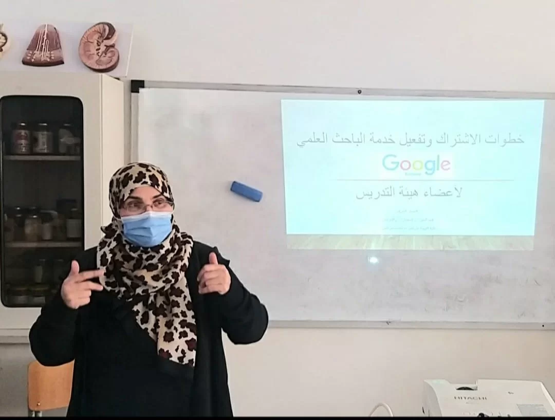 ( google scholar) وكيفية استخدامه، كما ساعدت بعض خريجات القسم على توثيق مشاريعهنّ على موقع الجامعة. حضر الورشة رئيس قسم الأحياء: أ. فدوى مهني، وبعض أعضاء هيئة التدريس بالقسم:أ. سارة بن زقلام وكيل الكلية المكلف. أ. هدى بن زائد مدير مكتب المعلومات والتوثيق بالكلية. أ. سمية الحداد منسق المعلومات والتوثيق بالقسم. أ. مغفرة والي معيدة بالقسم. . بعض خريجات القسم. واستضاف القسم د. محمد الشويهدي رئيس قسم الجودة وتقييم الأداء بكلية الطب البيطري / جامعة طرابلس.