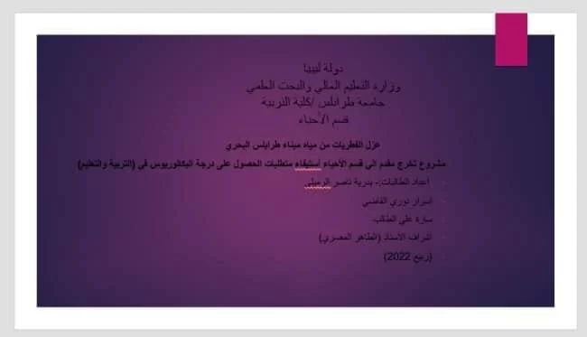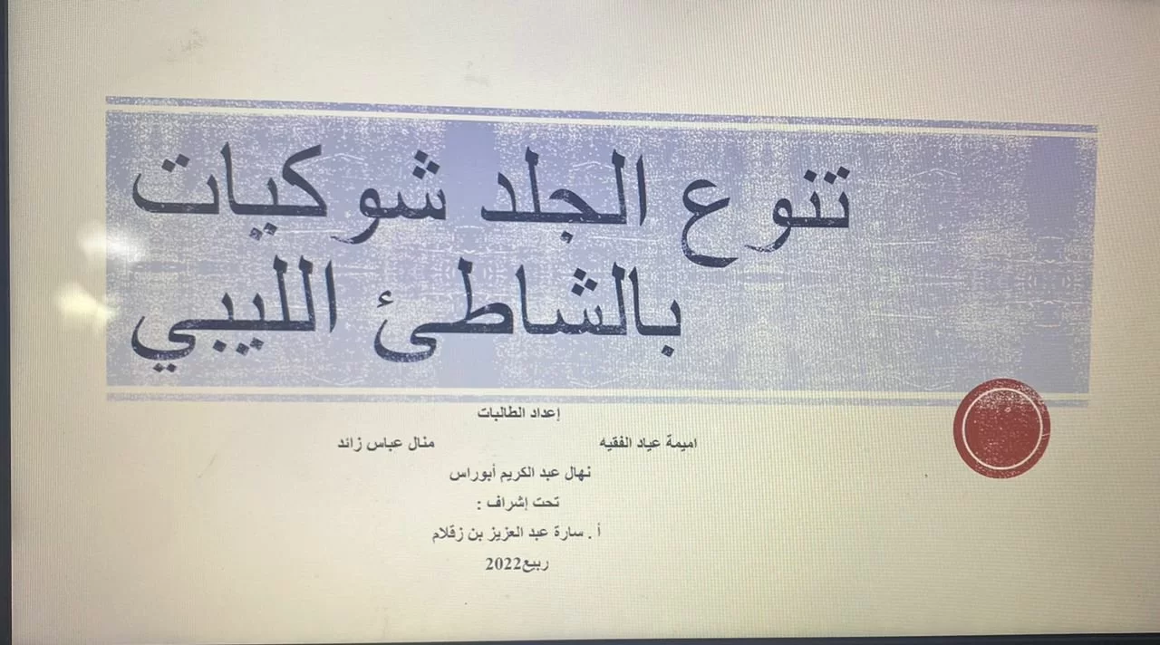 أميمة عياد الفقيه ، نهال عبدالكريم أبوراس ، منال عباس زايد بعنوان ( تنوع شوكيات الجلد بالشاطئ الليبي ) تحت إشراف أ.سارة زقلام