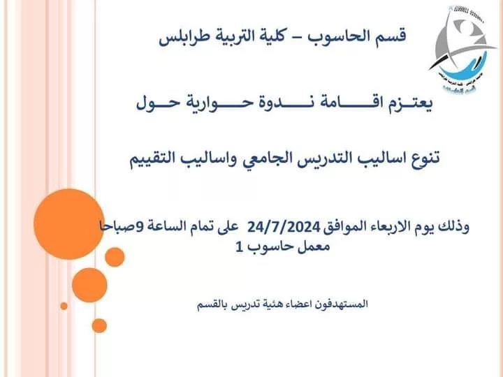 #نشاطات_قسم_الحاسوب أقام قسم الحاسوب يوم الأربعاء الموافق 24/07/2024 ندوة حوارية حول تنوع أساليب التدريس الجامعي وتنوع اساليب التقييم.وقد شارك مجموعة من أعضاء هيئة التدريس بالقسم في هذه الندوة وتم مناقشة وطرح العديد من أساليب التدريس والتقييم المتبعة للمقررات القسم.