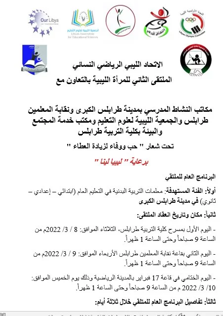 تقف الرياضة النسائية و اللاعبات الرياضيات اليوم علي اعتاب حقبة جديدة ونحن فخورين بما حققناه خلال السنوات القليلة الماضية من خطوات و انجازات متعددة و نتطلع بكل امل و عزيمة لمستقبل مزهر ملي بالنجاح و التميز للرياضة النسائية محليا و دوليا من هنا نحتفي في اليوم العالمي للمراة 08/03/2022م تحت شعار حب و وفاء لزيادة العطاء يستضيف مكتب خدمة المجتمع وتنمية البيئة بمسرح كلية التربية الملتقى الثاني للمراة الليبية بالتعاون مع مكاتب النشاط المدرسي بمدينة طرابلس الكبرى ونقابة المعلمين و اللجنة الليبية لعلوم التعليم برعاية اللجنة الاولمبية الليبية و الاتحاد الليبي الرياضي النسائي و شركة ليبيانا