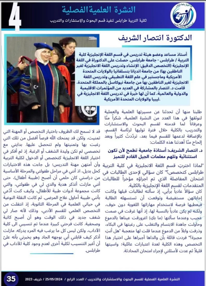 صدر العدد الرابع من النشرة العلمية الخاصة بقسم البحوث والاستشارات والتدريب بكلية التربية طرابلس الذي يتم فيه الاحتفاء بإنتاج أعضاء هيئة التدريس العلمي المتمثل في البحوث المنشورة في المجلات العلمية ومشاركاتهم في المؤتمرات العلمية وتنفيذهم للورش العلمية والدورات التدريبية.وقد تم تخصيص صفحات ف