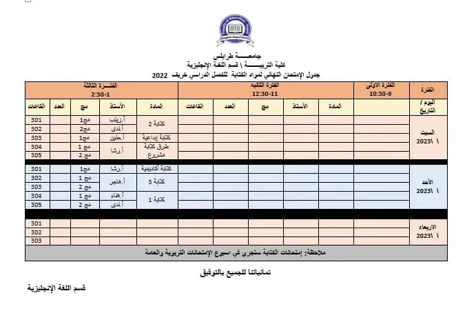 إعلان عن مسودة جدول الإمتحان النهائي لفصل الخريف 2022
