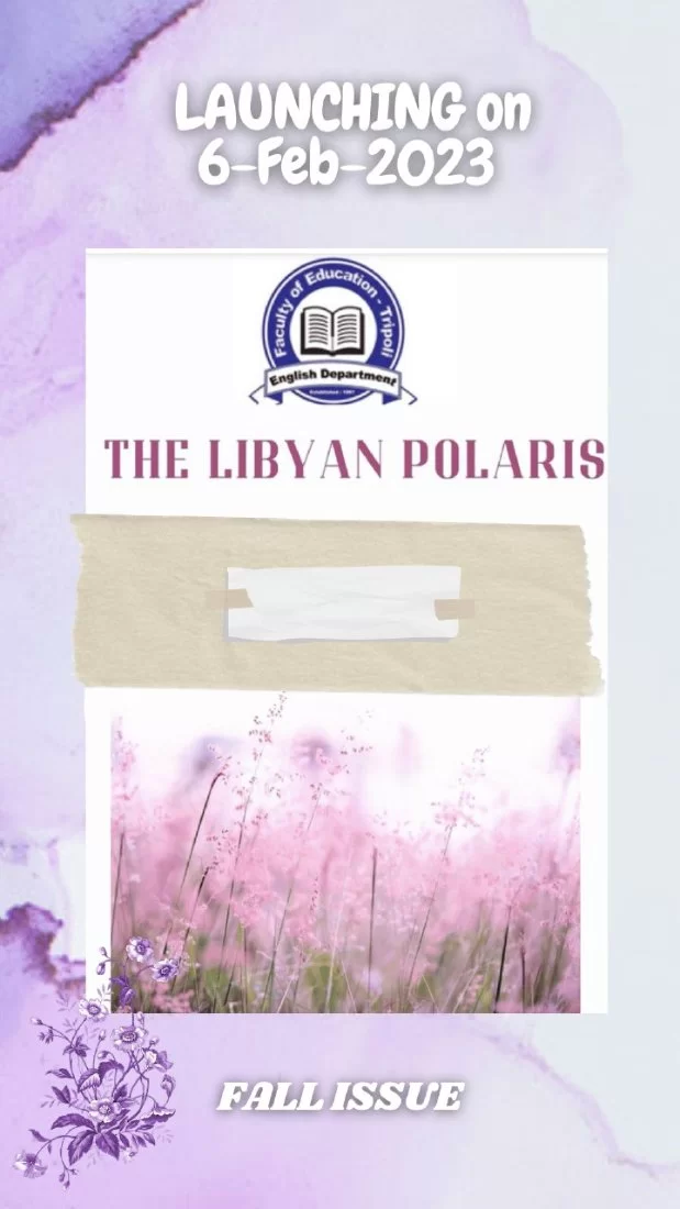 إصدار العدد السادس لمجلة قسم اللغة الانجليزية The Libyan Polaris سيكون بإذن الله يوم الإثنين 6/2/2023. وسيكون أول إصدار الكتروني للمجلة..ترقبوا العدد ..مع دعواتنا لفريق المجلة بالتوفيق.