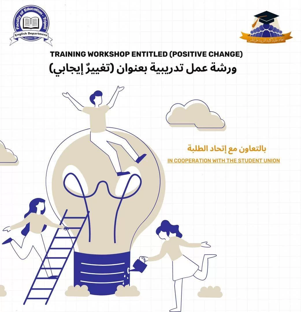 يُعلن قسم اللغة الإنجليزية بالتعاون مع إتحاد طلبة كُلية التربية عن إقامة ورشة عمل تدريبية بعنوان (تغييرٌ إيجابي) تدريب تفاعلي من شأنه تغيير حياتك الى الأفضل. محاور التدريب: ١-اساليب التغيير للأفضل. ٢-كيف اكون شخصية ايجابية واقعية. ٣-العمل على تنظيم وترتيب الوقت. ٤-القدرة على العمل بكفاءة وانجاز