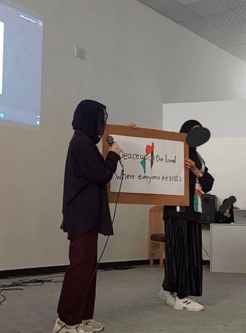 قام طلاب مادة تطوير المفردات اليوم بتاريخ 2024/6/08بتنظيم وقفة تضامنية داخل مسرح الكلية استهدفت استخدام مهاراتهم اللغوية لكتابة جمل وعبارات تعبر عن آرائهم حول القضية الفلسطينية، وقد تم تجسيد هذه الأفكار على لوحات تم عرضها بواسطة الطلاب واحتوت على تعبيرات ابداعية أظهرت مدى استيعاب الطلاب وقدرتهم على استخدام المفردات بطريقة مؤثرة ومعبرة وتعكس مشاعرهم ووجهات نظرهم. الجهود التي بذلها الطلاب اليوم كانت محل تقدير كبير، حيث أنهم لم يقتصروا على استخدام المفردات الجديدة فحسب، بل أيضًا عرضوا قدرتهم على التفكير والتعبير بطريقة فنية مبتكرة. إن هذا النوع من الأنشطة يعزز من مهارات التواصل لدى الطلاب ويشجعهم على التعبير عن أفكارهم بثقة وإبداع وبطريقة تلامس قضايا الساعة وتحاكيها. كل الشكر والتقدير لكل من قاموا على تنظيم هذا الحدث ونخص بالذكر أستاذة المادة ا.هاجر ابورخيص والطالبات اللاتي قدمن هذا النشاط وقاموا بالاشراف عليه.منسق التوثيق و المعلومات