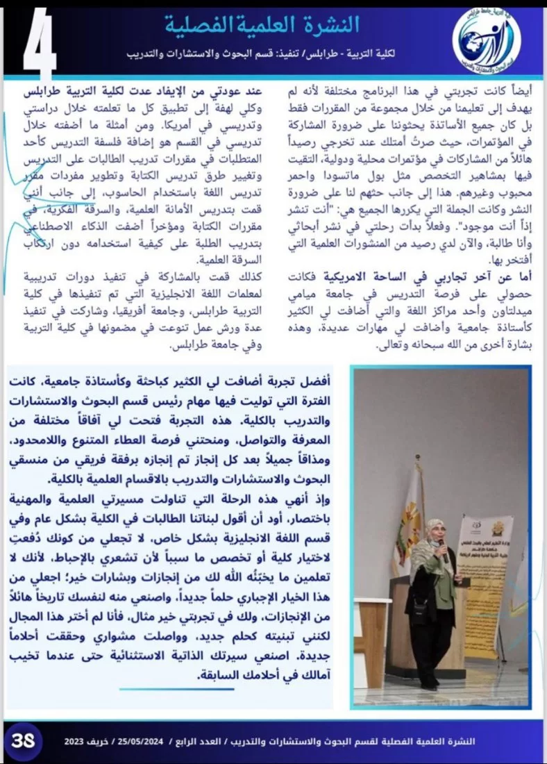 صدر العدد الرابع من النشرة العلمية الخاصة بقسم البحوث والاستشارات والتدريب بكلية التربية طرابلس الذي يتم فيه الاحتفاء بإنتاج أعضاء هيئة التدريس العلمي المتمثل في البحوث المنشورة في المجلات العلمية ومشاركاتهم في المؤتمرات العلمية وتنفيذهم للورش العلمية والدورات التدريبية.وقد تم تخصيص صفحات في هذا العدد للدكتورة انتصار الشريف أحد أعضاء هيئة التدريس بالقسم للحديث عن أهم المحطات في مسيرتها العلمية والمهنية آملة فيه أن تحفز مسيرتها العلمية الطالبات على بذل المزيد من الجهد وتحقيق الآمال التي قد تبدو صعبة المنال.بامكانكم الإطلاع على العدد كاملا من خلال الرابط التالي: https://www.facebook.com/share/p/VQCDmwwtpTt7EPo8/?mibextid=xfxF2iمنسق التوثيق و المعلومات