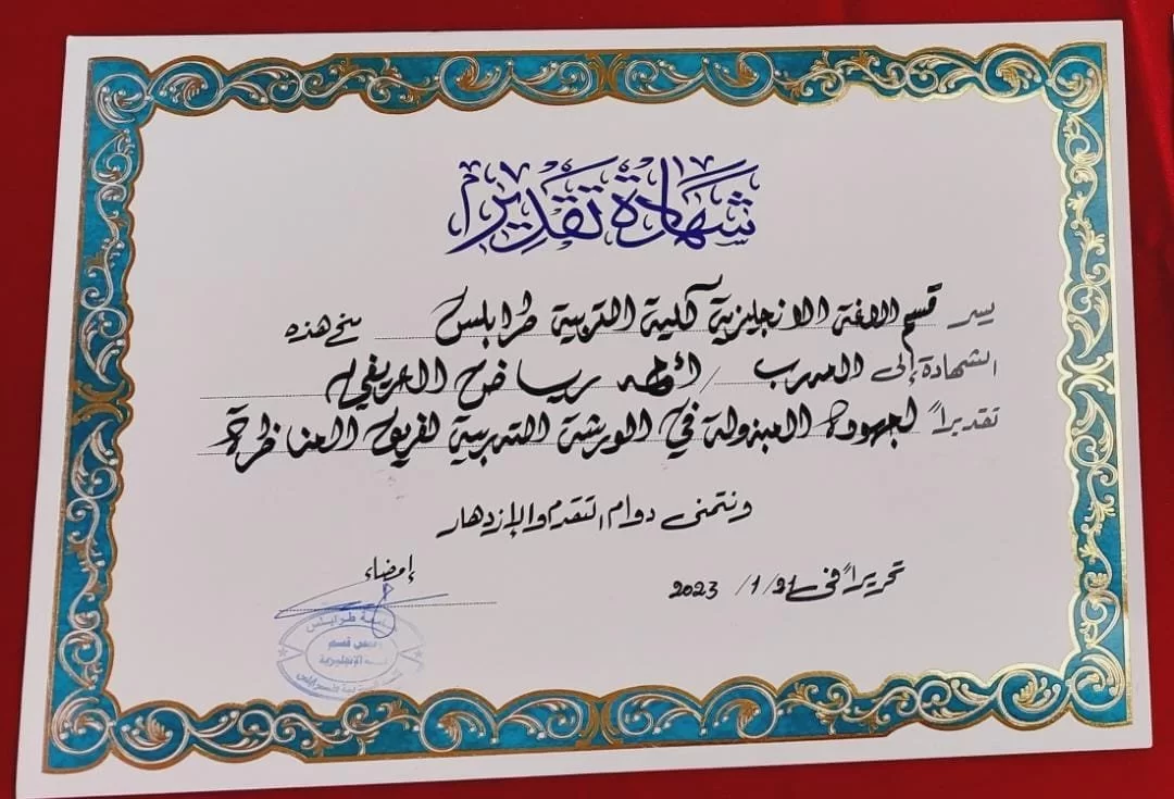 خطوة جديدة من خطوات الإبداع نحو بناء معلم الغد بمهارات المستقبلبدعوة من السيدة منسق النشاط بقسم اللغة الإنجليزية و بدعم من إدارة الكلية استضاف قسم اللغة الإنجليزية اليوم السبت 21\1\2023 عند الساعة العاشرة صباحاَ مدربين من نادي المناظرة بجامعة طرابلس وذلك لإدارة ورشة عمل لأساسيات مهارات وفن المناظرة.الهدف الأساسي لهذه الورشة هو بناء وتأسيس فريق للمناظرة باللغة الإنجليزية كأول فريق بكلية التربية وأول فريق متخصص باللغة الإنجليزية بجامعة طرابلس، وذلك من أجل بناء فريق قادر على المناظرة والحوار والمشاركة في أنشطة ومنافسات المناظرة التي تقام على المستويين المحلي والإقليمي والدولي.كما هدفت هذه الورشة إلى المساهمة في تنويع مجالات النشاط الطلابي بالقسم و تقوية فريق النشاط وصقل المنتسبين إليه بالمهارات اللازمة التي تدعم المهارات اللغوية و ربط ما يدرسه الطالب من مقررات بواقع الحياة اليومية والمواقف الحياتية التي يواجهها الطلاب من جهة و ربط الطلاب و تعميق أواصر التواصل مع القسم العلمي وأساتذته لبناء شخصية معلم المستقبل المتميز.استغرقت الورشة أربع ساعات وتميزت بإبداع المدرب محمد بن عاشور في التقديم والعرض وطرح الأفكار و أسئلة الحوار التي وجهها للحاضرين كما تميزت بحماس و تميز وفاعلية طلاب القسم ومشاركاتهم وردودهم، وتخللت الورشة عدد من التدريبات والتوجيهات التي شدت إهتمام الفريق.تعتبر الورشة بداية لسلسة من الورش التي سيعقدها المدرب مع الفريق و سيتم ربط الفريق بفرق المناظرة بجامعة طرابلس بعد تدريبات للفريق لصقل مهاراته أكثر.قسم اللغة الإنجليزية يتقدم بخالص الشكر والتقدير لنادي المناظرة بجامعة طرابلس خاصة السيدان محمد بن عاشور وأحمد العريفي لتلبيتهم الدعوة والحضور و دعم فريق المناظرة بقسم اللغة الإنجليزية كلية التربية طرابلس.وخالص التقدير والإمتنان للسيد د. عميد كلية التربية طرابلس د.سامي حمدي لدعمه للفريق و تسهيل سبل نجاح هذه الورشة وحرصه على تقديم كافة الخدمات التي تدعم نجاح برامج النشاط الطلابي بالقسم والكلية،والشكر موصول للسيدة منسق النشاط بالقسم أ.حنين المنتصر و الطلاب الذين حضروا الورشة و الطالبة آسيا الزغداني عن إتحاد طلبة كلية التربية والطالبة أروى الأطرش التي خطت شهادات تقدير الضيوف والفريق.سيظل قسم اللغة الإنجليزية يفخر بكادره التدريسي وبطلابه وسيكون الفريق إنطلاقة جديدة لتميز فريق النشاط بكلية التربية طرابلس.#قسم اللغة الانجليزية