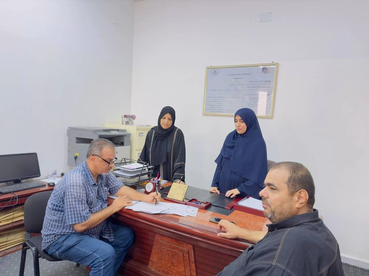 في أجواءٍ تسودها الأُلفة والود والتقدير تم صباح هذا اليوم وبحضور أعضاء اللجنة: - د. فهيمة بالنور رئيس اللجنة- د.محمد التومي عضو اللجنة- أ. محمد الأرناؤوطي عضو اللجنةتسليم واستلام رئاسة قسم الدراسة والامتحانات بالكلية بين السيدة الفاضلة/ د. ربيعة عويدان