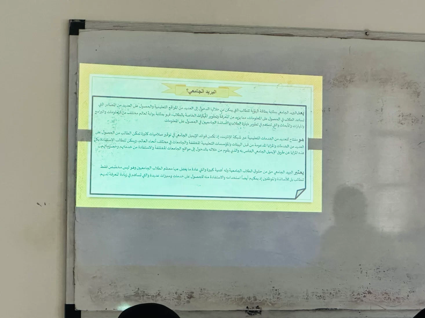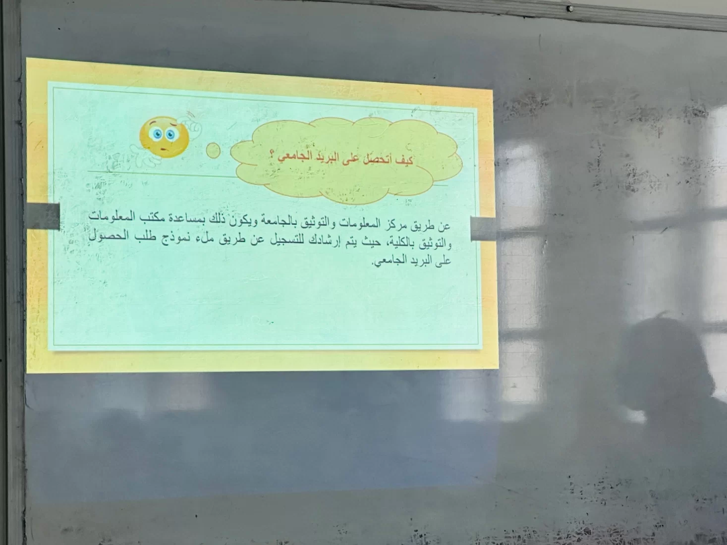 تطرّقت الورشة إلى التعريف بالبريد الجامعي ومدى أهمية الحصول عليه ، لاستخدامه بما يفيد الطالبات في مسيرتهنّ الدراسية، وقد أوضحت لهنّ مديرة المكتب تفصيليًا خطوات التسجيل، وساعدت الطالبات في نهاية الورشة للتسجيل فيه وانتظار حصولهنّ عليه لبدء تفعيله واستخدامه.